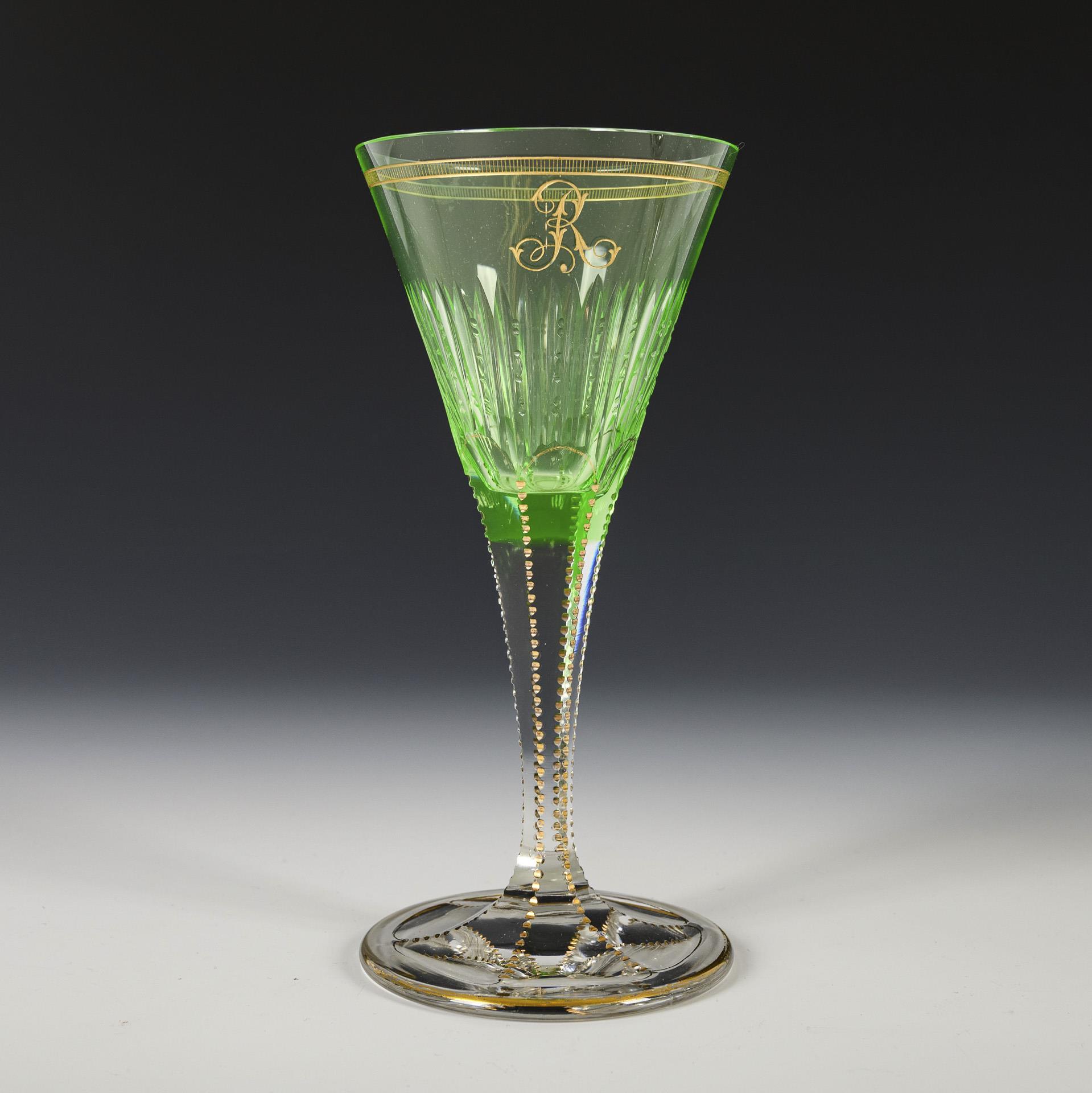 Konische Uranglas-Kuppa mit Kerbschliffkranz, sechsfach facettierter Schaft mit geschlägelten Kanten, Rundfuß. Schauseitig auf der Kuppa der gravierte und vergoldete Buchstabe "R".