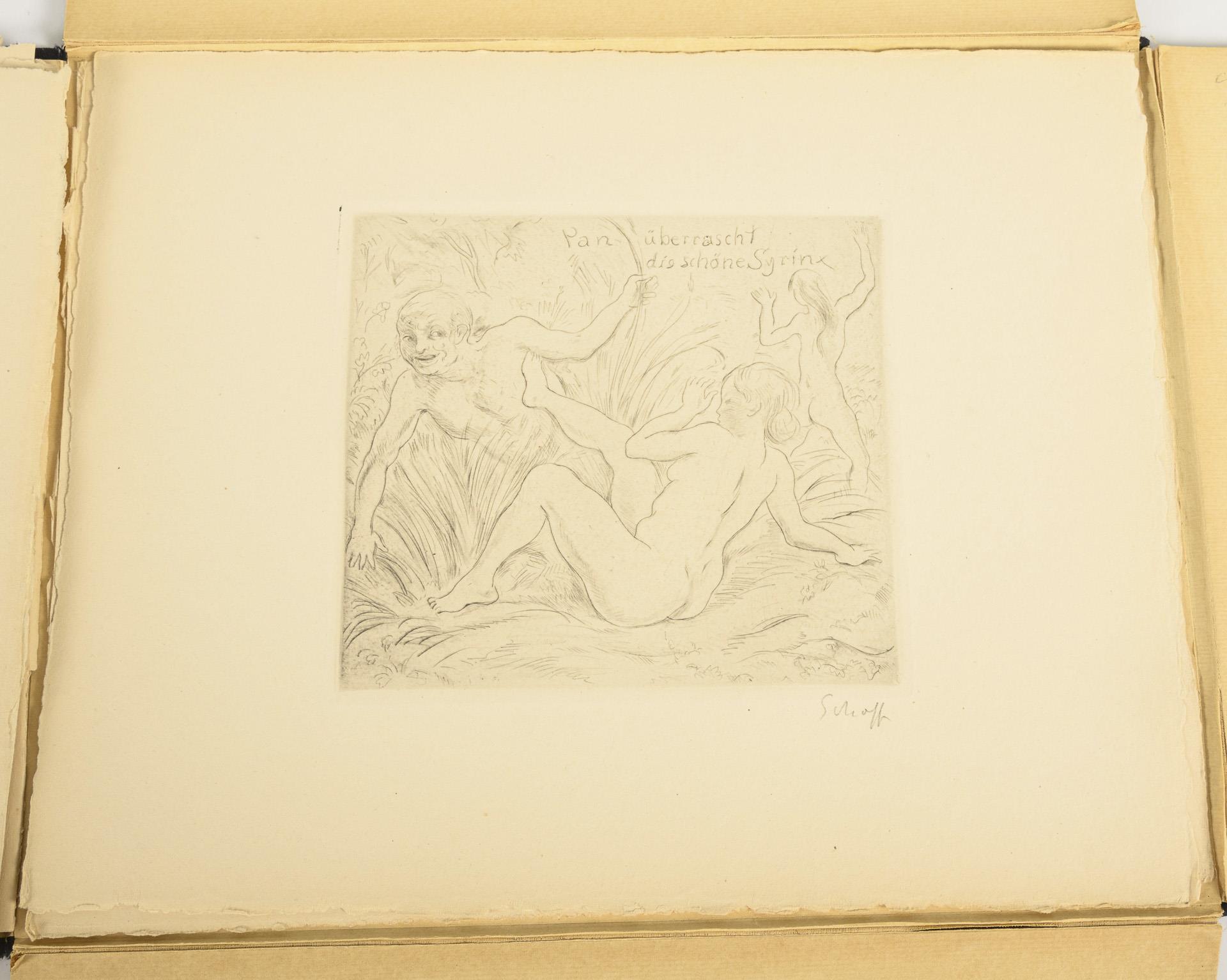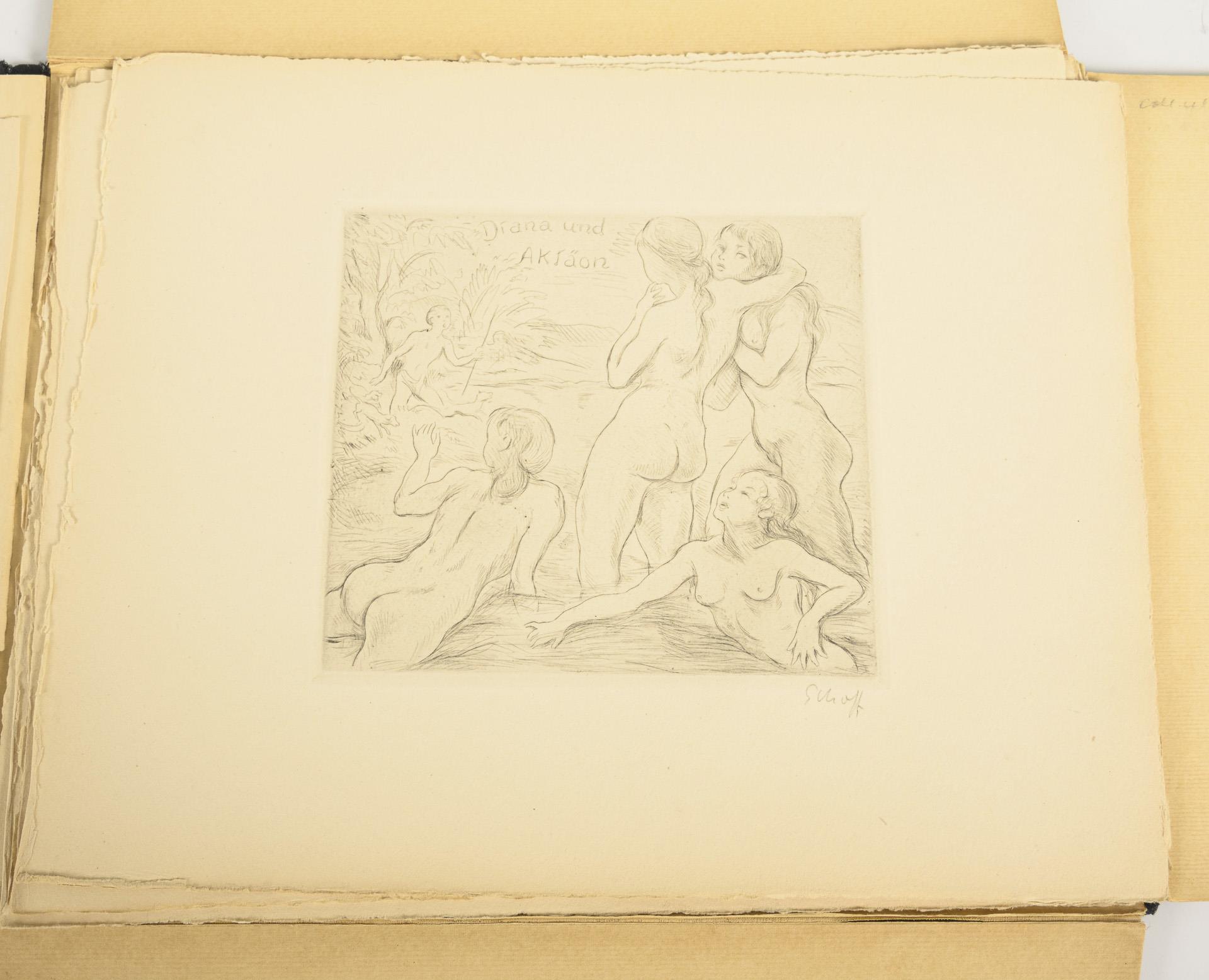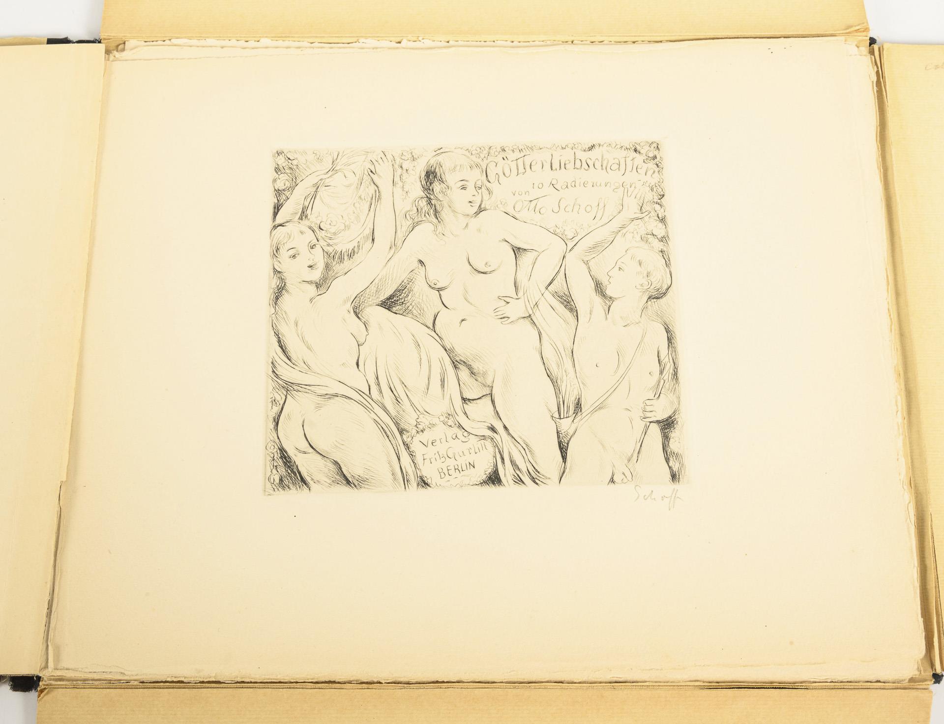 Erotische Darstellungen. 75. Werk der Gurlittpresse. Nummeriertes Exemplar, Auflage von 10 Radierungen (5 auf Japan- und 5 auf Büttenpapier). Dies ist B2. Mappe mit 10 signierten Radierungen und ein Blatt mit Verlagsangaben. Mappe mit Altersspuren, Rücken etwas eingerissen.