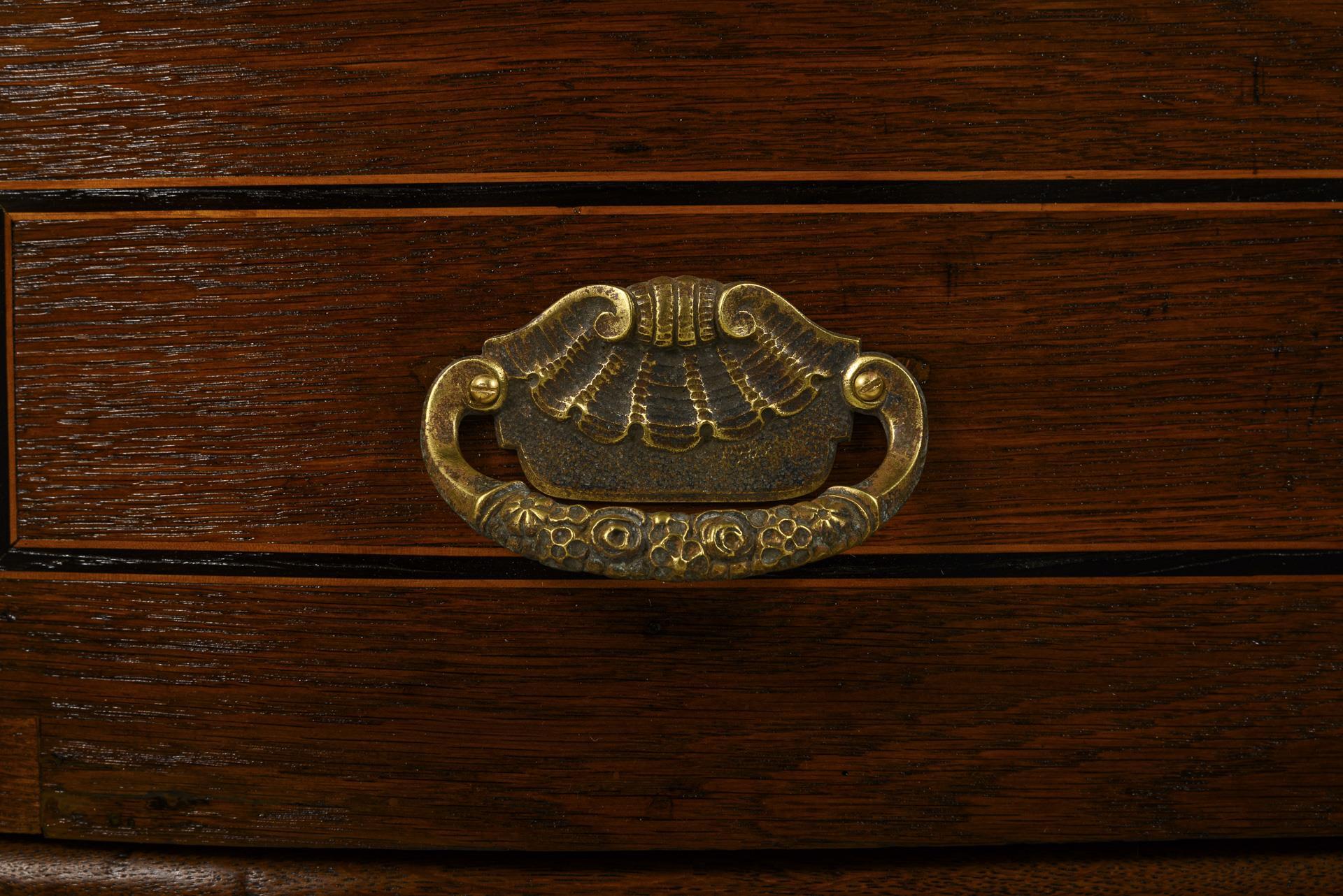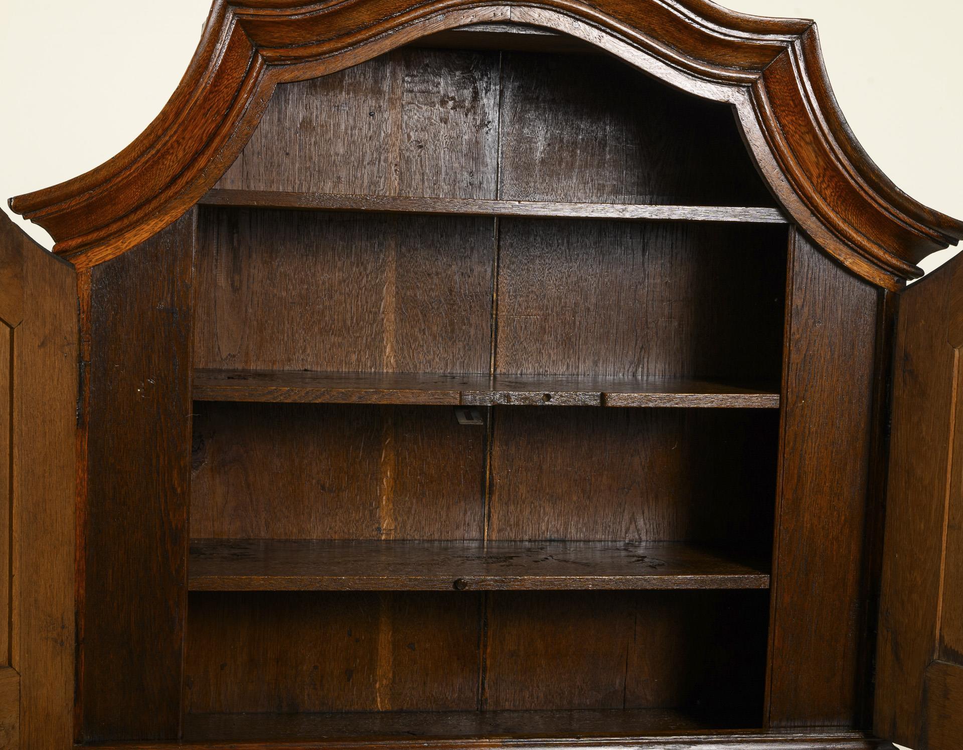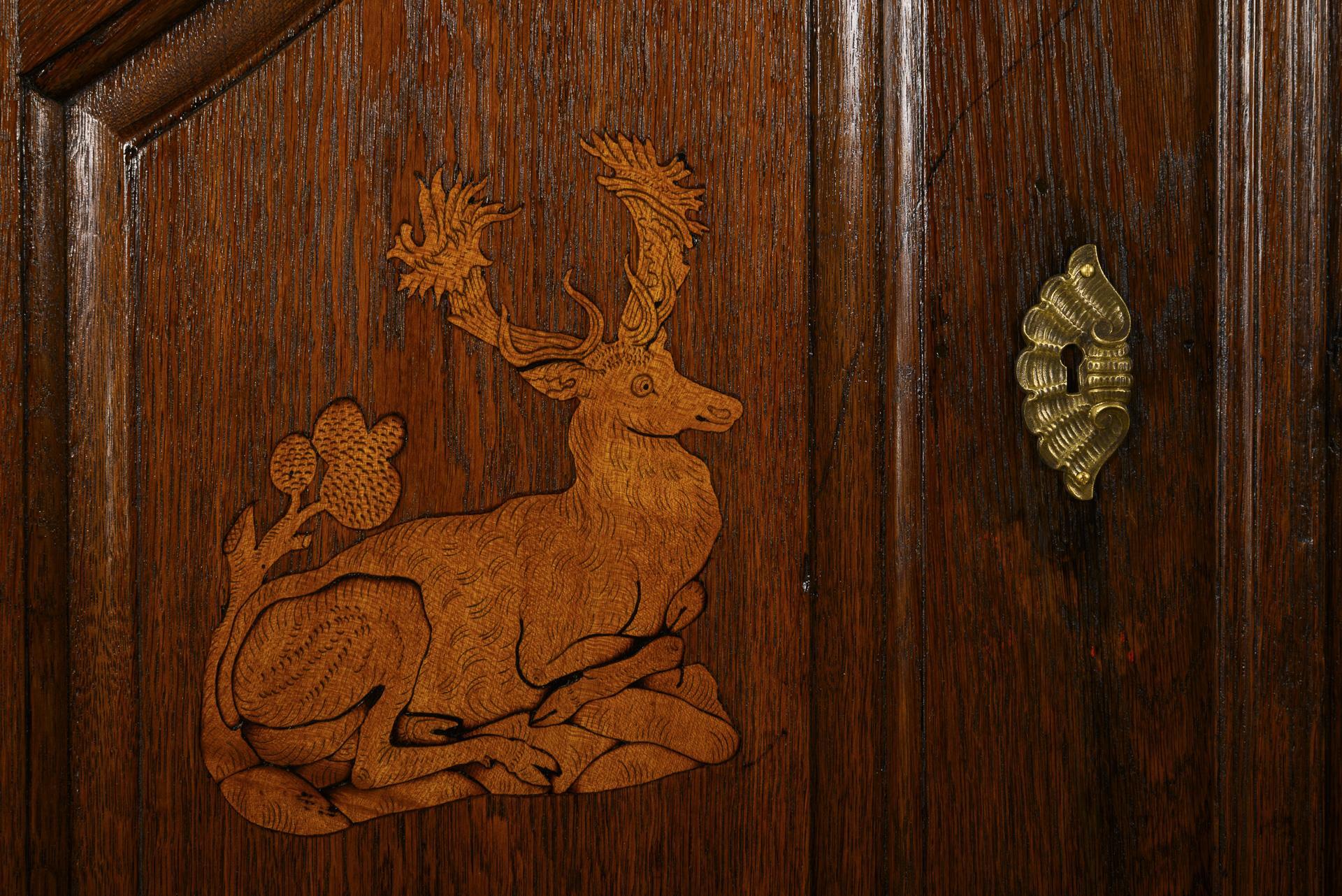 2-teilig. 2-türiger Aufsatz mit geschweiftem Giebel. 3-schübiger Unterschrank mit geschweifter Front, Schrägpult und klappbarer Schreibplatte, auf 4 gedrückten Kugelfüßen. Allansichtig kassettierter Korpus mit reichen Kehlungen, intarsiert mit Hirschen und Wildschweinen sowie Band- und Fadeneinlagen für Scheinkassettierung der Schübe. Aufsatz innen mit 3 Ablageböden, Schreibfach innen mit offenem Mittelfach, flankiert von je 4 Schüben mit Holzknäufen. Muschelförmige Schlüssellochbeschläge und Griffe aus Bronze, Eisenschlösser. Restauriert, unterster Schlüssel verklemmt.