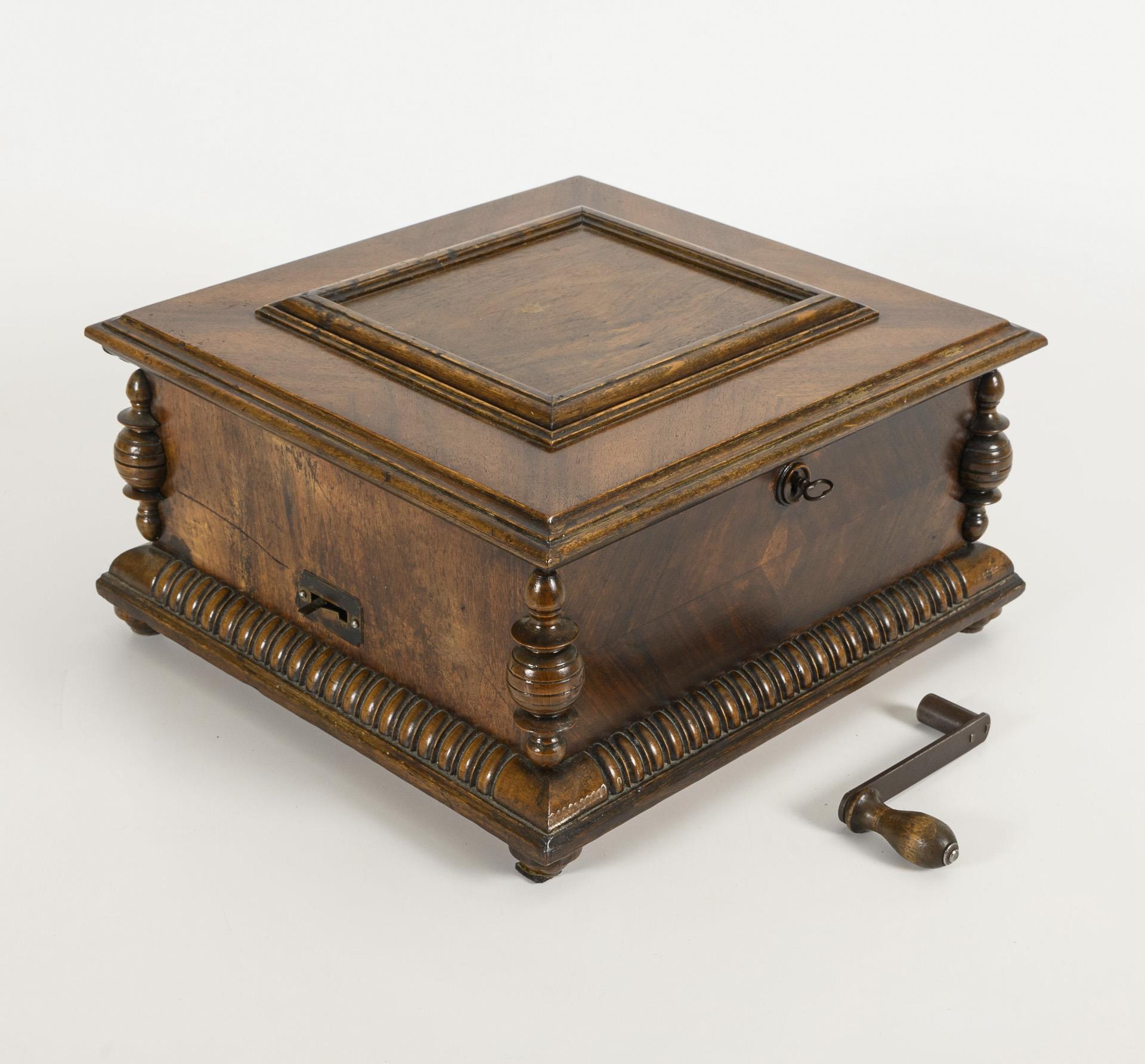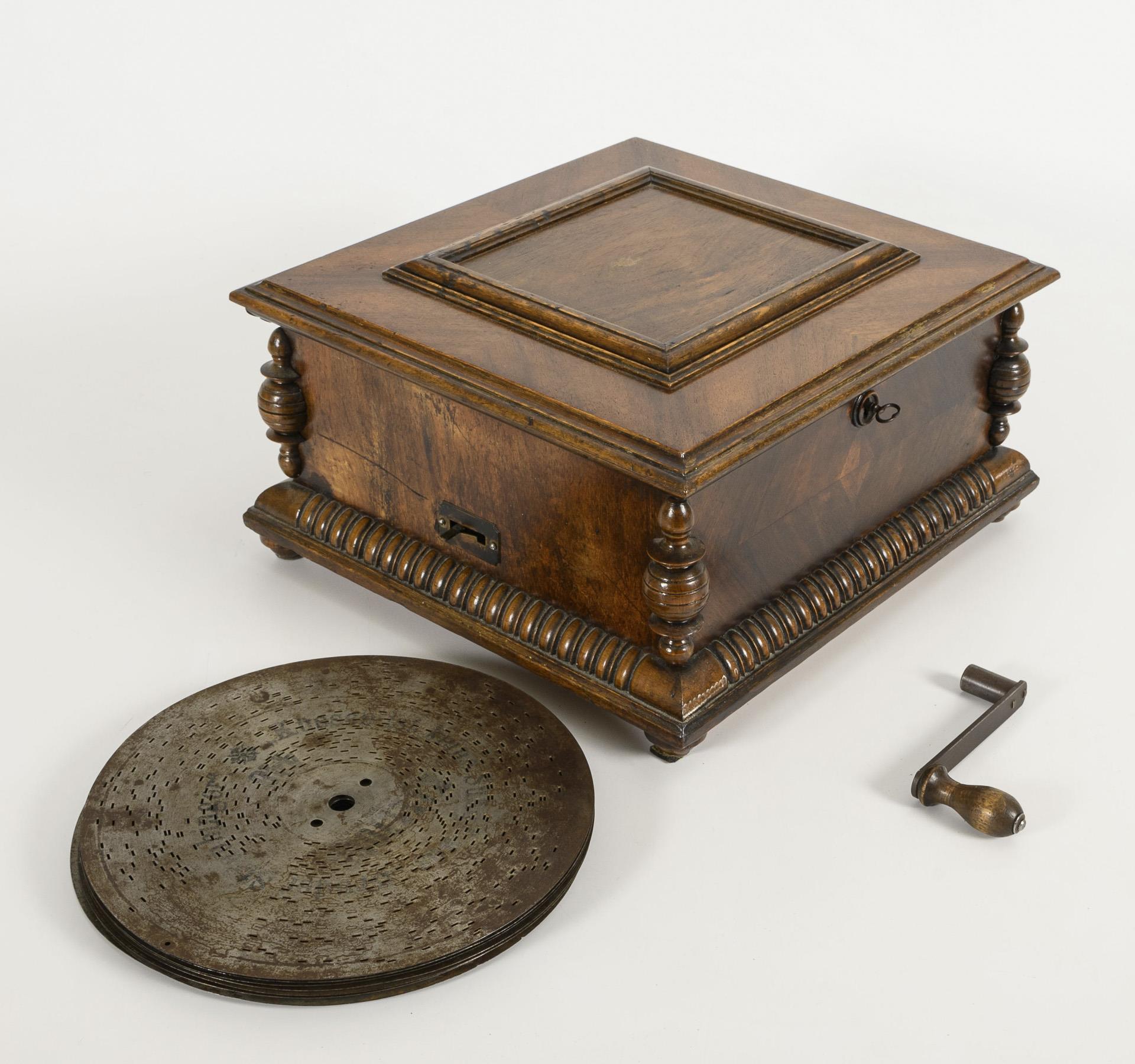 "Spieluhr" mit Drechselzier an den Fußleisten und an den Ecken, Stellhebel an der Seite sowie aufgesetzte Kassette auf dem Scharnierdeckel; im Deckel Fotoausdruck: Tanzendes Paar. Goldbronzierte Gusseisen-Grundplatte mit Jugendstil-Blättern, Werk mit geschlitzter Achse für die Kurbel, Zentralantrieb und Zungenkamm sowie ausschaltbares Glockenspielwerk mit 6 Glocken. Kalliope gemarkte Platten, z.B. Die Taube, Es ist ein Reis entsprungen, Und der Teufel lacht dazu, Deutsche Nationalhymne usw. Funktioniert, einige Alters-/Gebrauchsspuren am Gehäuse, Platten häufig rostig.