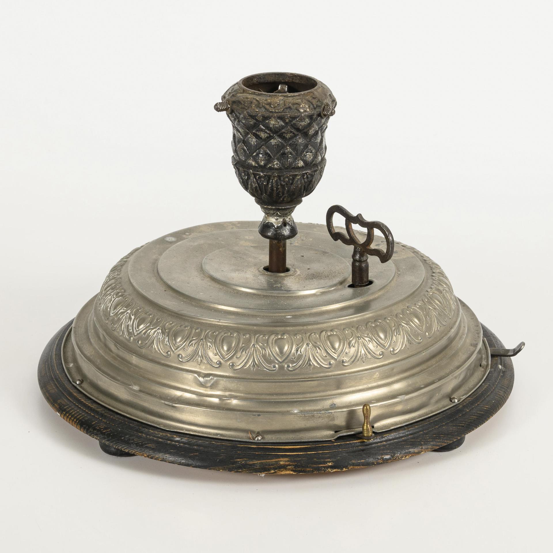 Weihnachtsbaumständer mit 2 Stellhebeln und Ornamentfries am gestuften Gehäuse sowie drehbare Baumhalterung aus Gusseisen. Zuschaltbares Spielwerk mit 2 Liedern: Oh, du fröhliche und Stille Nacht. Funktioniert mit Nebengeräuschen, Alters-/Gebrauchsspuren.