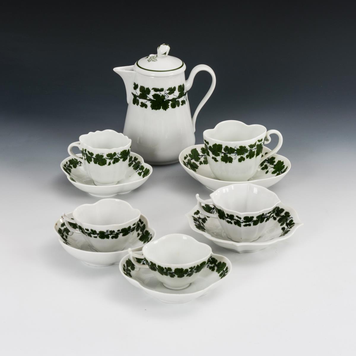 Kakaokanne und 5 Tassen mit Weinlaubdekor. Meissen.