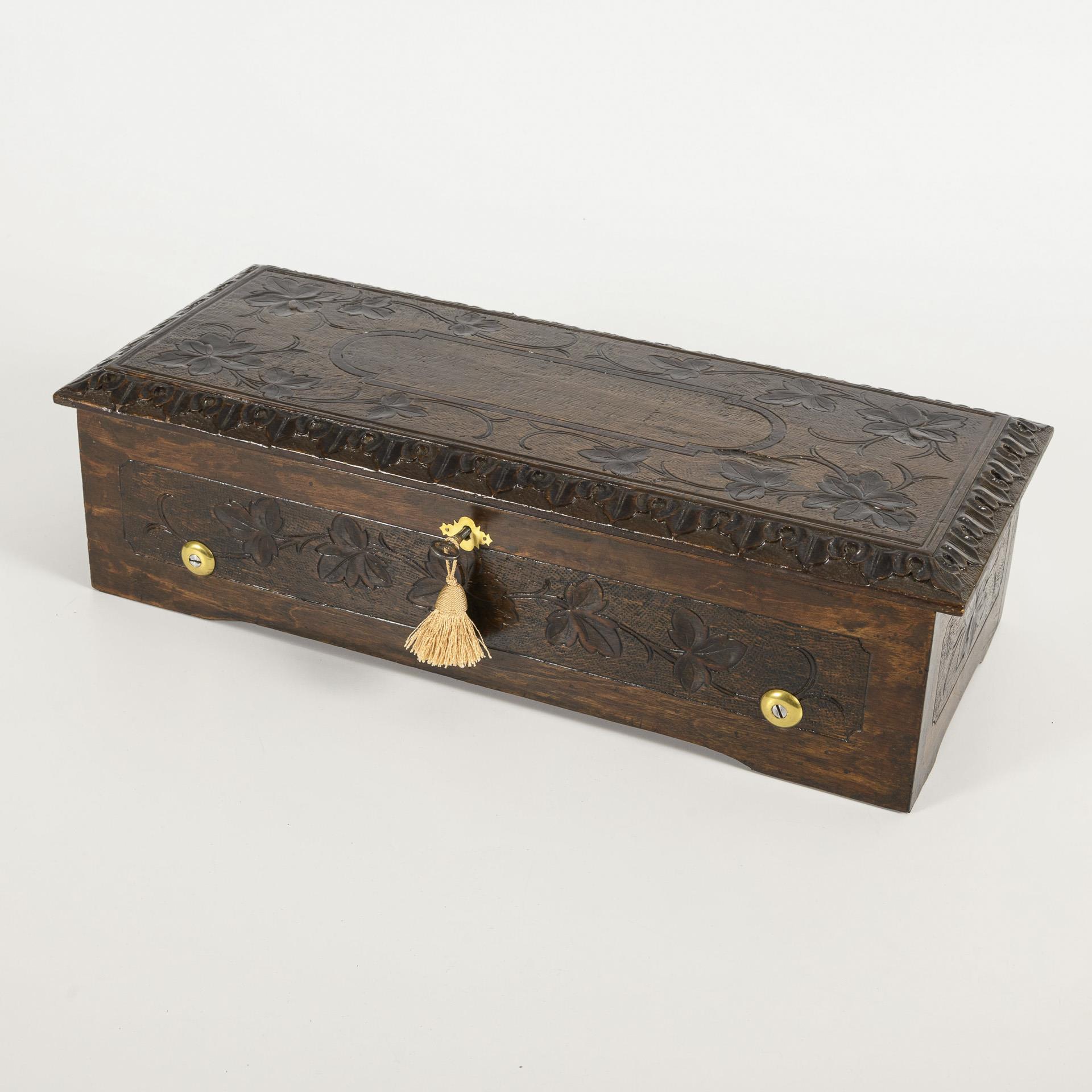 "Walzenspieluhr" mit vegetabiler Schnitzerei auf allen Seiten und auf dem Scharnierdeckel. Im Deckel teils geprägter Firmenzettel mit 8 Liedern, z.B. Die Zigeunerin, Wilhelm Tell, Springinsfeld usw.. Innen Ratschenaufzug und 2 Stellhebel; unter der Verglasung das Spielwerk mit steingelagertem Windrad sowie zuschaltbare Zitherfunktion. Restauriert, funktioniert.
