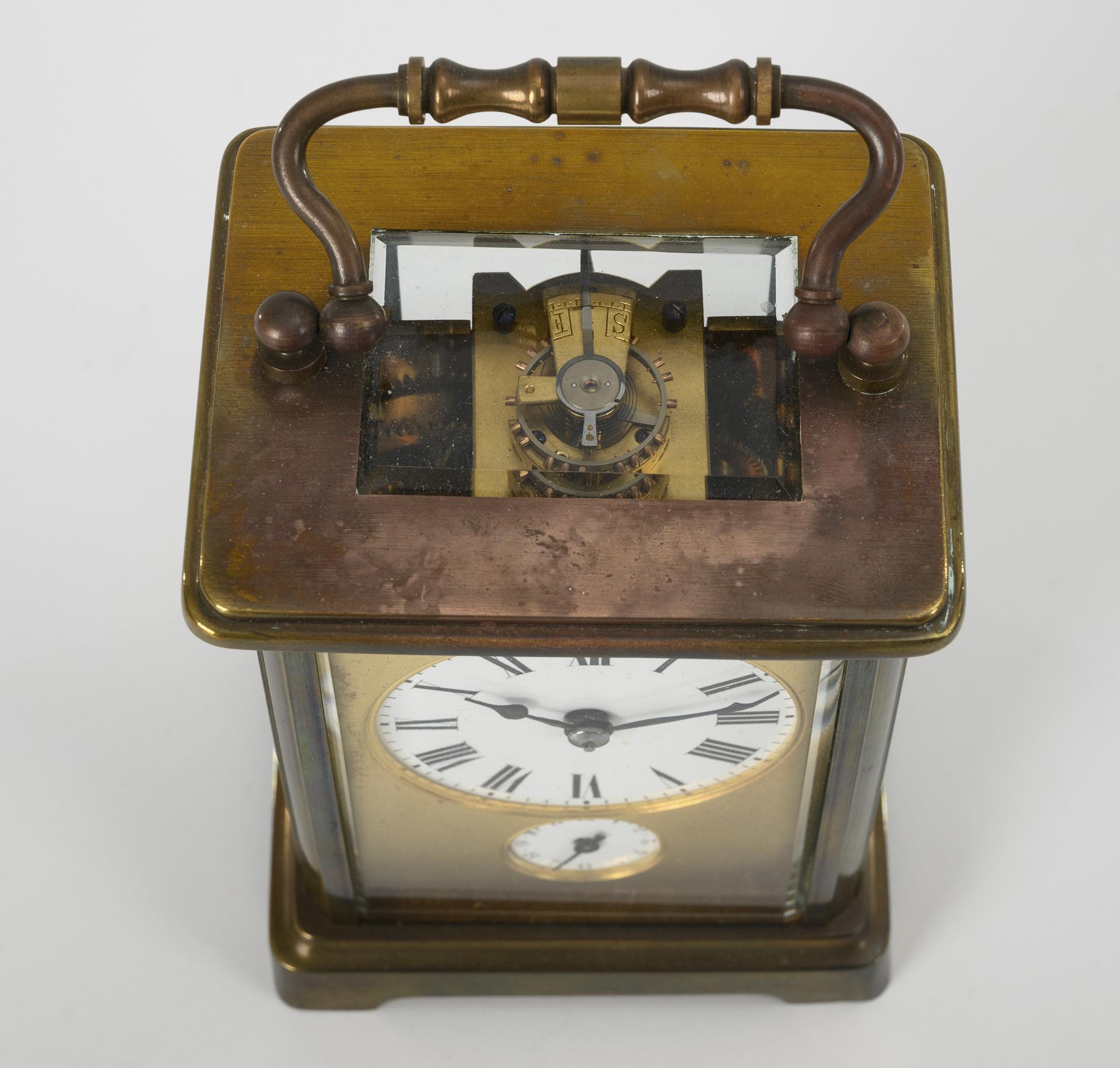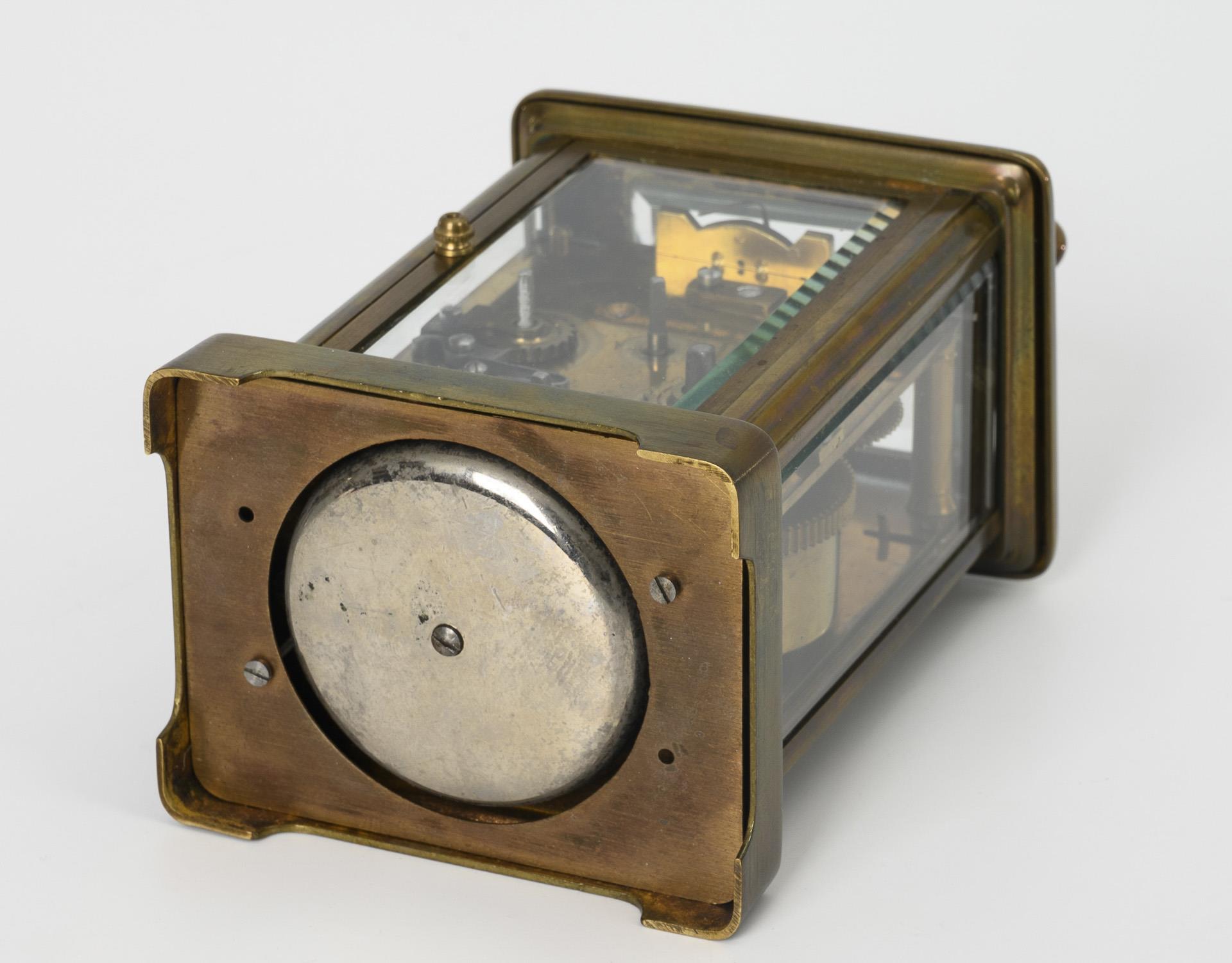 5-seitig facettiert verglastes Messing-Gehäuse mit geschweiftem Bügelgriff. Leichte Altersspuren, Zifferblatt mit Haarriss.