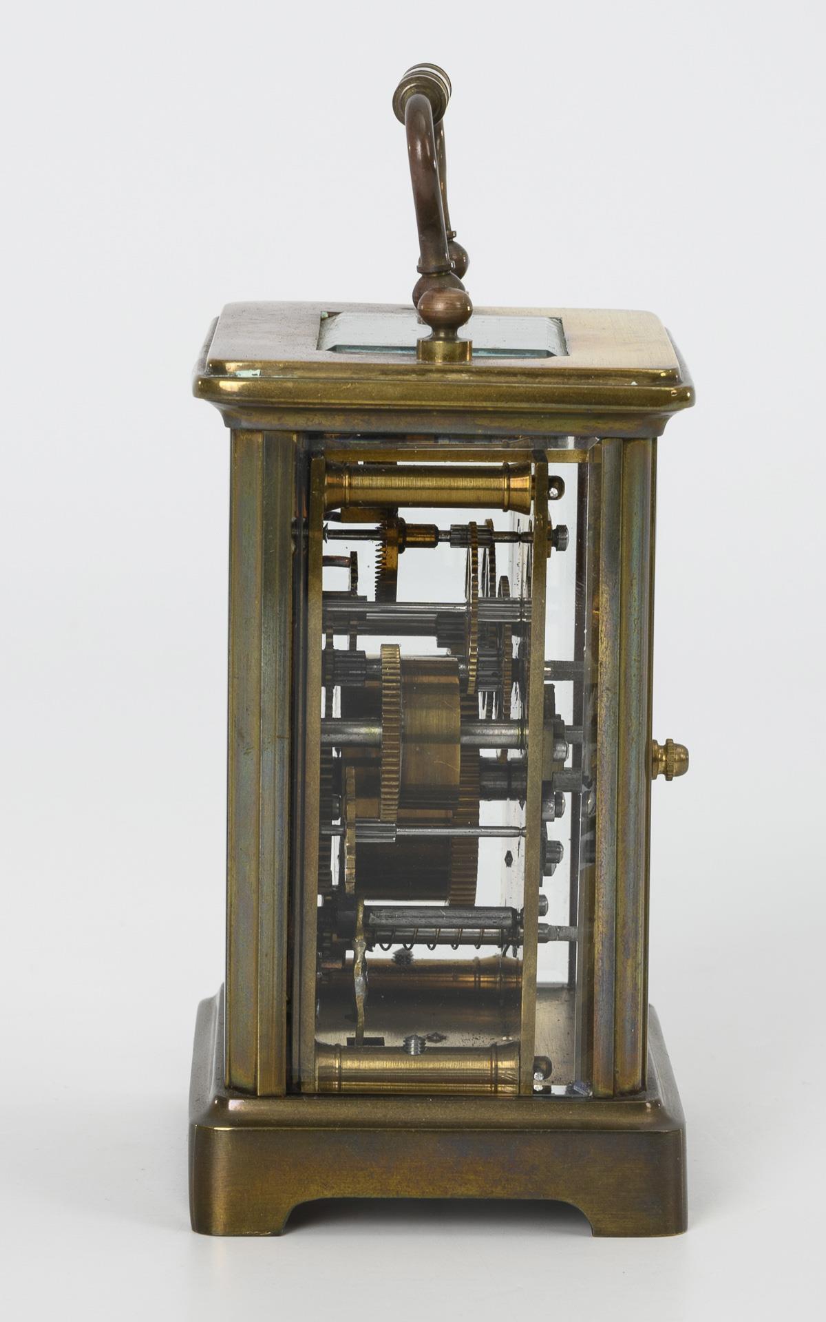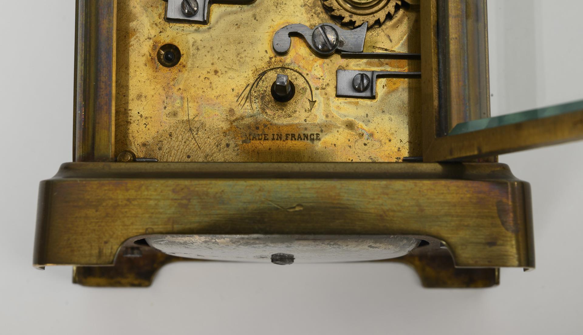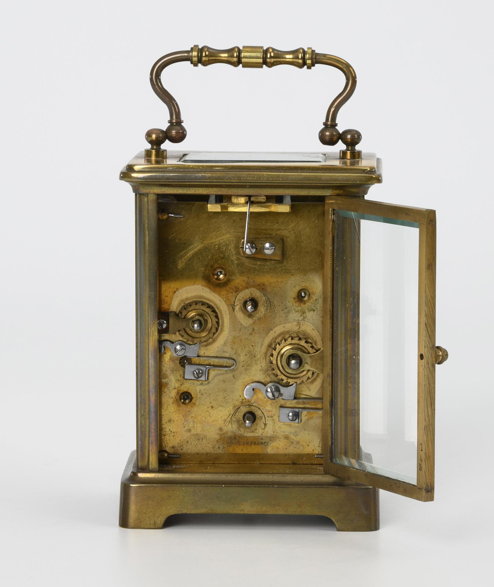 "Made in France" gemarktes Messingplatinenwerk mit oben liegender Unruh, Ankergang, Stunden-/Halbstundenschlag auf Rundgong, Weckschlag auf Rundgong, Schlüsselaufzug. Im Kurzzeittest funktionstüchtig. Weißes Emailzifferblatt mit römischen Zahlen, Minutenkranz, Spade-Zeigern und Hilfszifferblatt für Alarm.