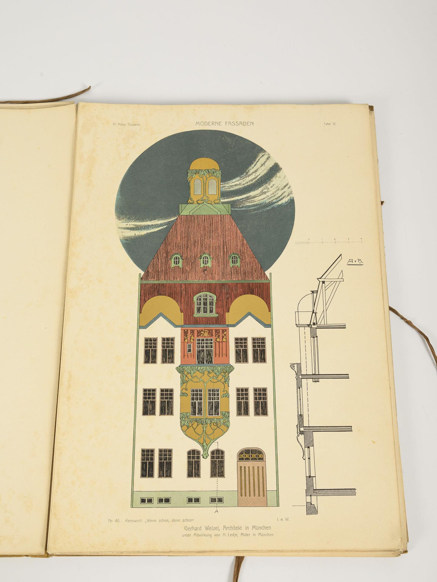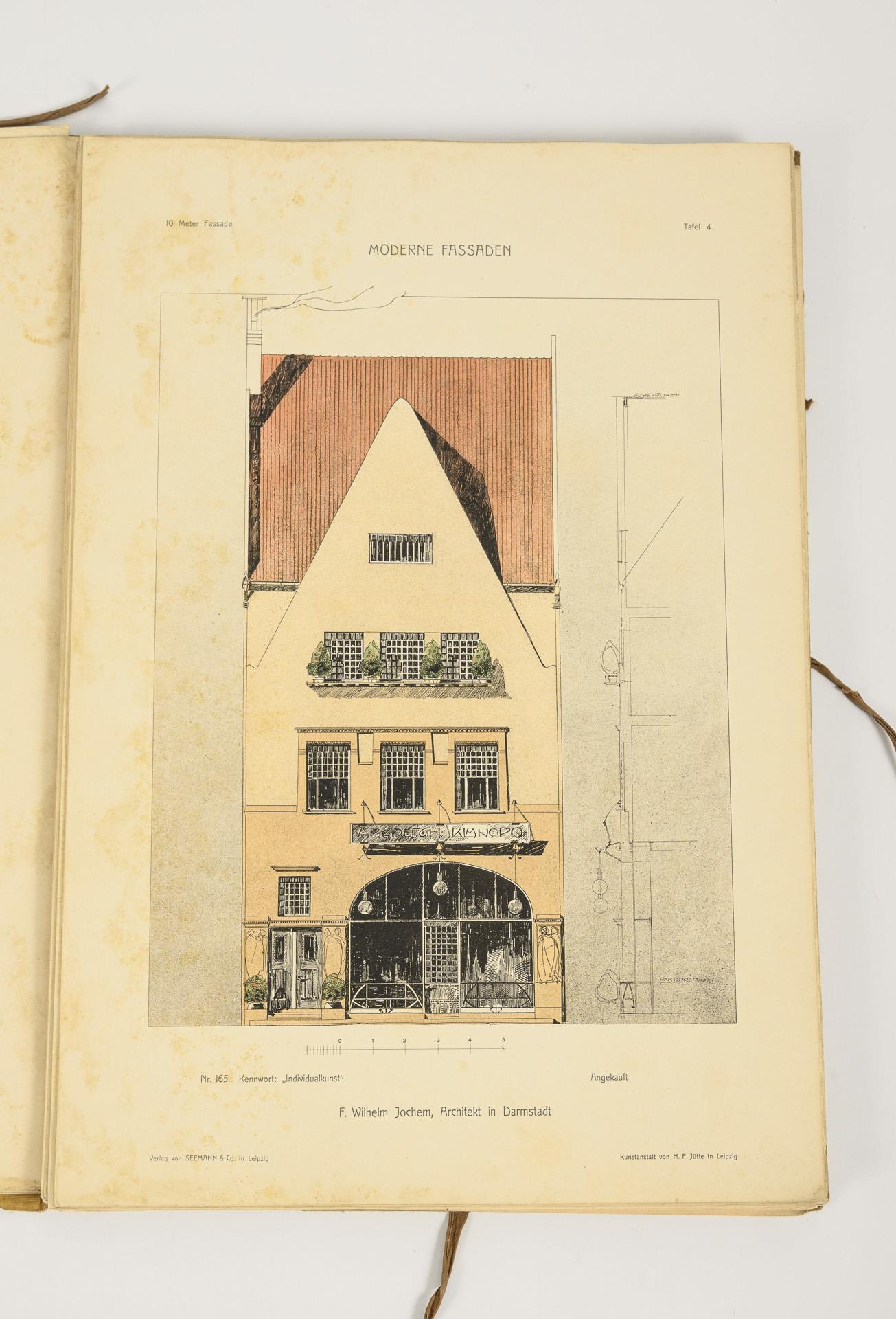 Herausgeber A. Neumeister, 10 Meter Fassaden. 45 Blätter mit Jugendstilfassaden von Häusern, teils farbig. Vollständig. Alters- und Gebrauchsspuren, Blätter teils stockfleckig.