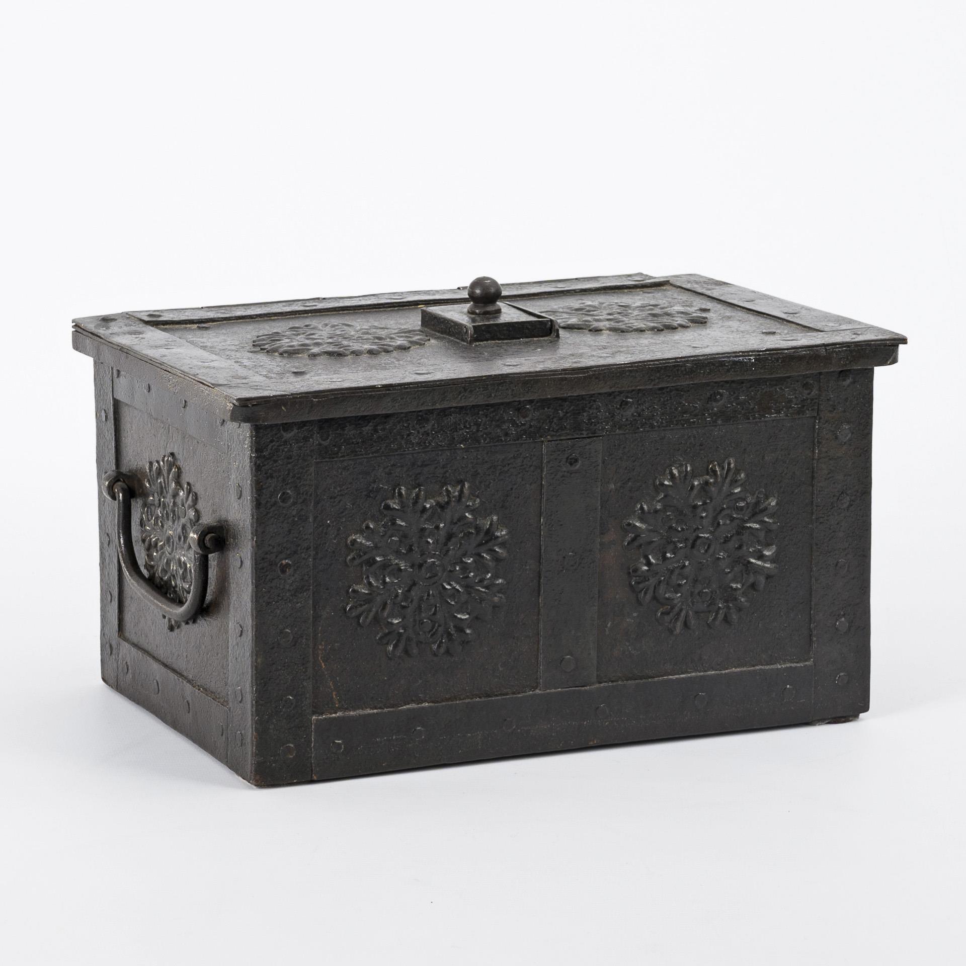 Quaderförmige Eisenschatulle mit Bandverstärkungen und applizierten Rosetten in allen Scheinkassetten sowie bewegliche Griffe an den Seiten. Auf dem Scharnierdeckel durch einen Drehknauf gesicherte Schlüssellochabdeckung; im Deckel Kastenschloss mit 6 beweglichen Riegeln. Kaum Alters-/Gebrauchsspuren.