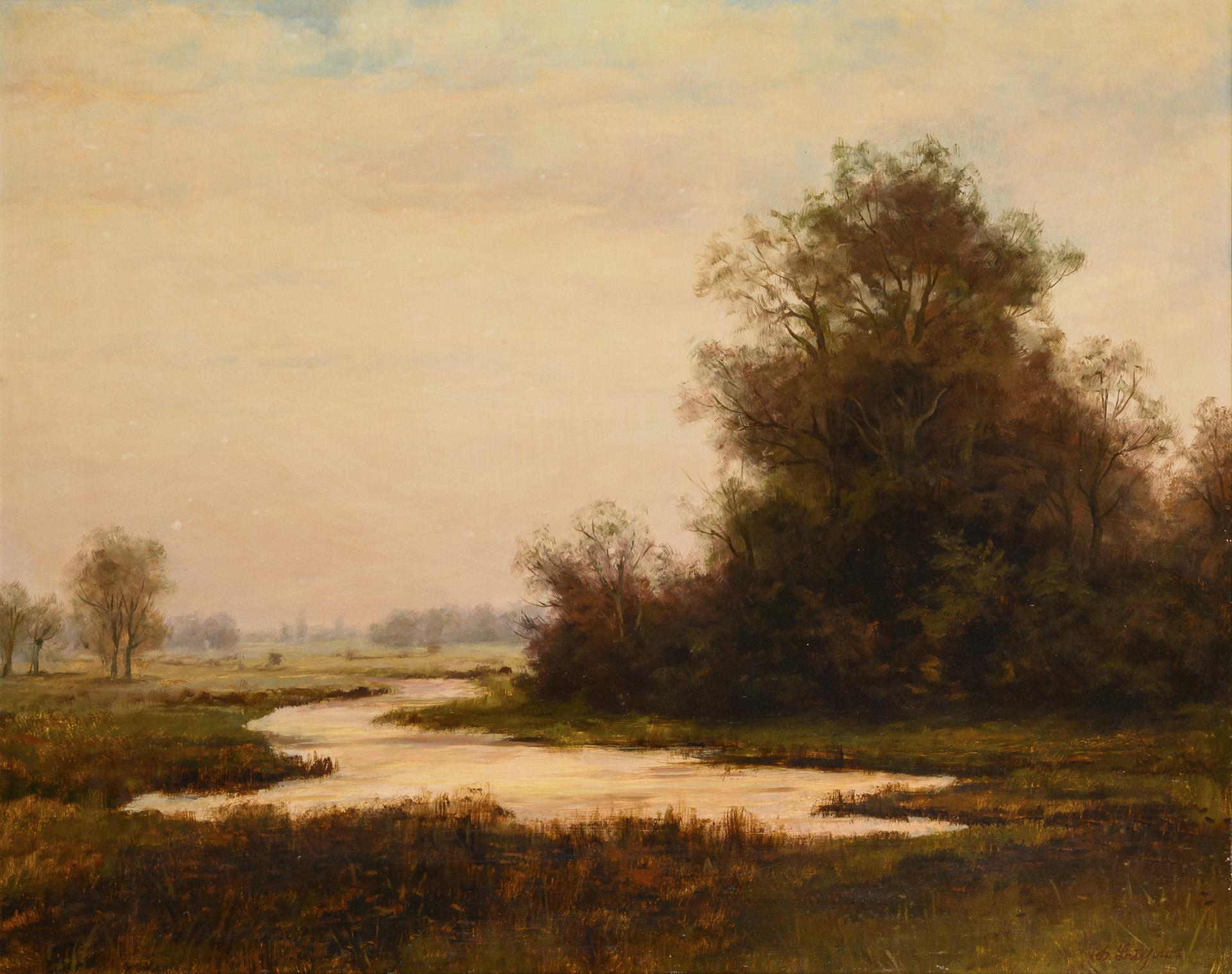 Undeutlich signiert: Abendliche Flusslandschaft