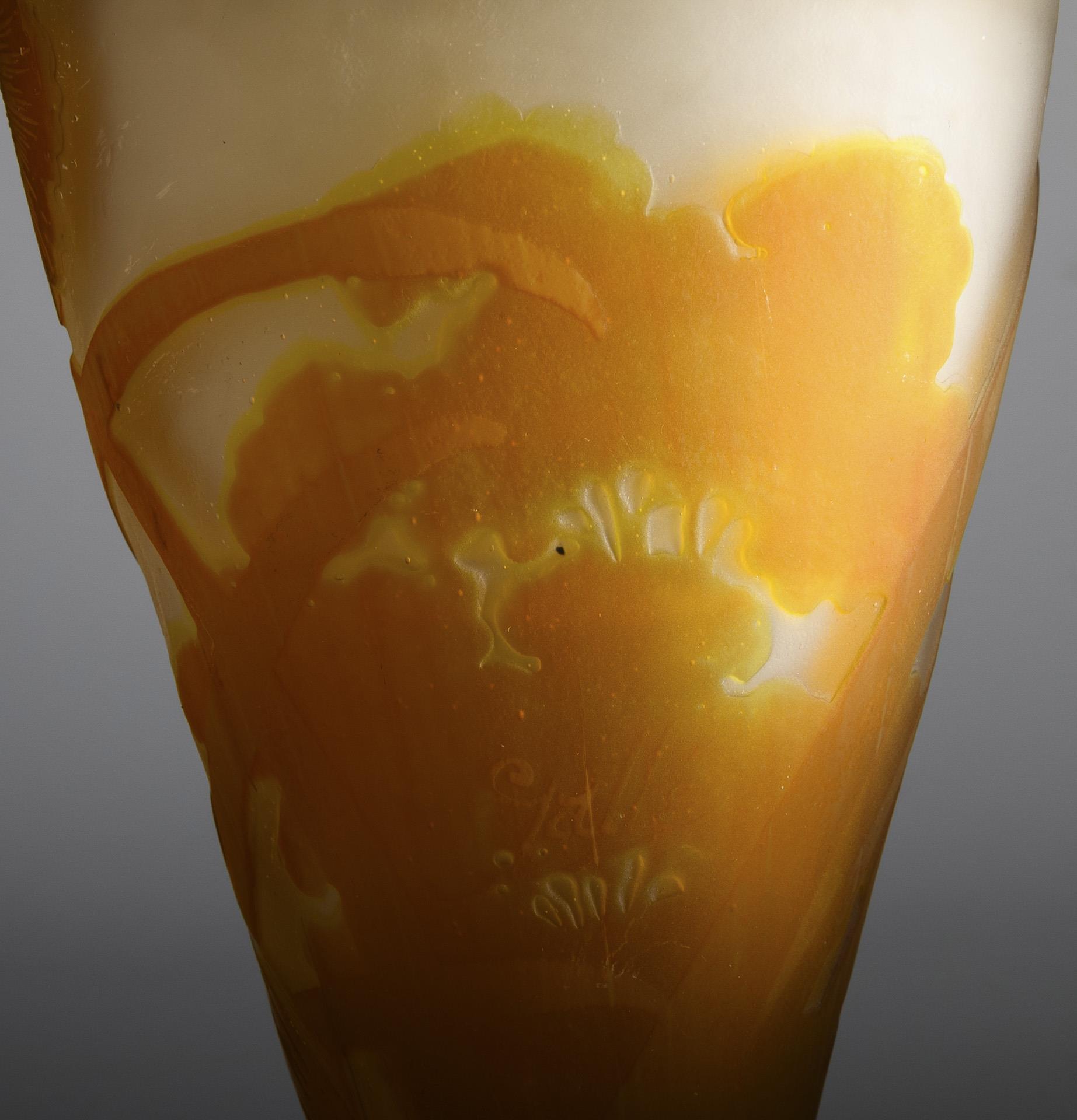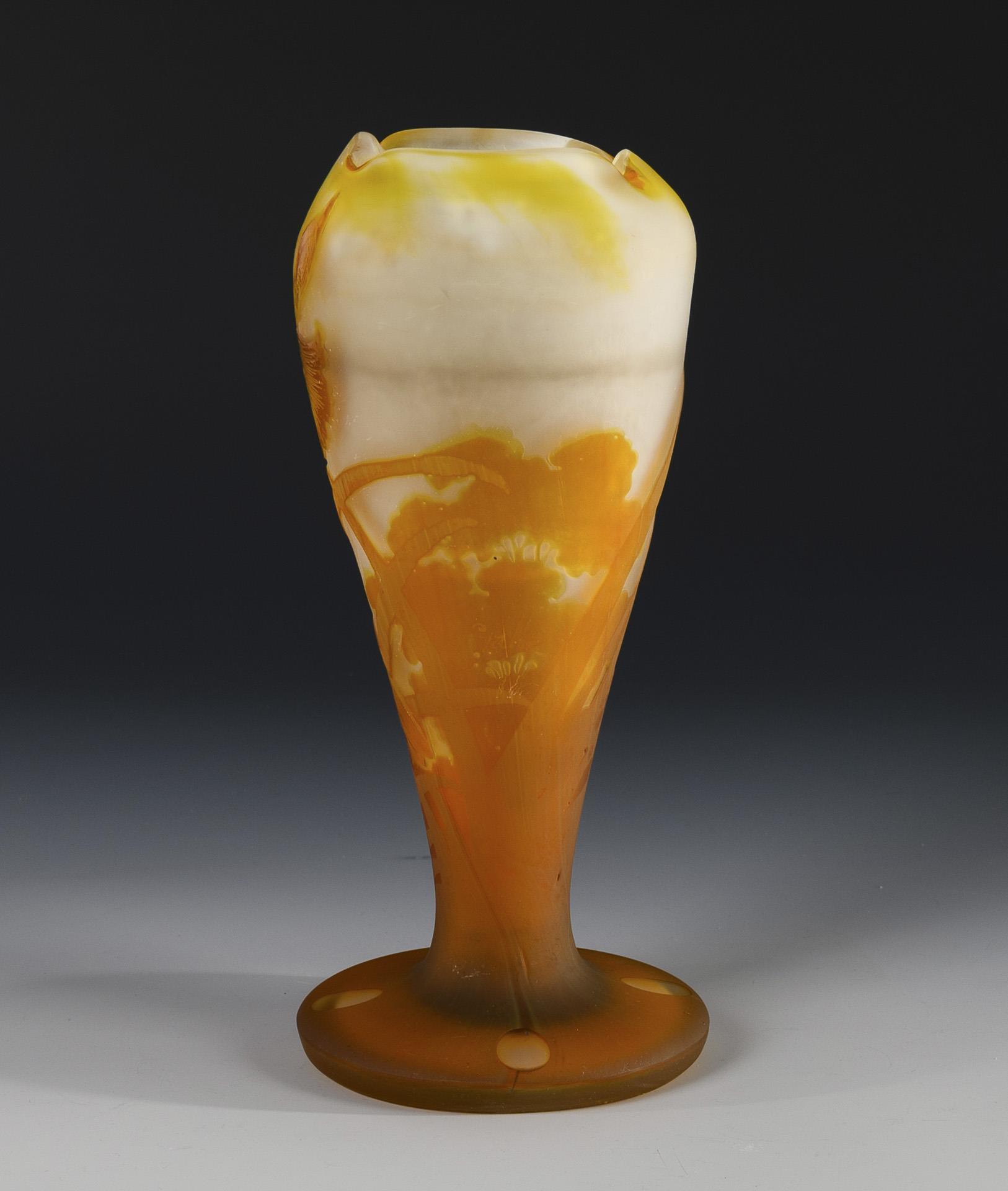 Farblose Glas mit weißem Innenfang sowie gelbem und orangefarbenem Überfang. H 26 cm.