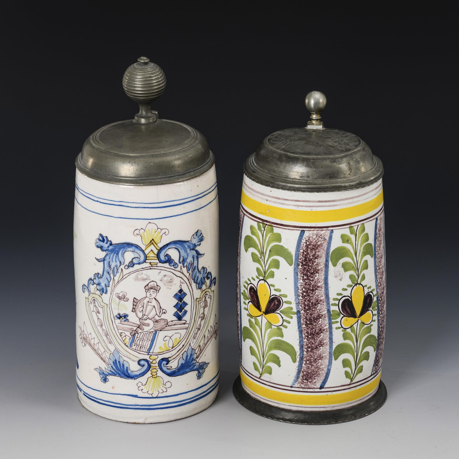 Kartuschenkrug mit Chinoiserie, flankiert von Palmbäumen, Pilasterkrug mit vertikalen Blütenfeldern. Jeweils mit Zinndeckel und Kugeldrücker, 1x Zinnstandring. Mit Defekten, Alters- und Gebrauchsspuren.
