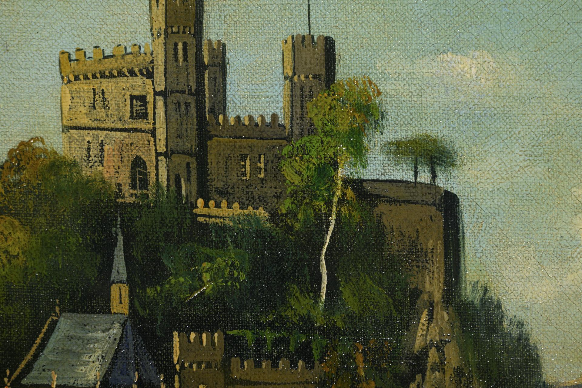 Staffagefiguren oberhalb des Flusses mit Blick hinüber zur Burg und Kirche auf dem Berg im Sonnenschein. Leichte Altersspuren.