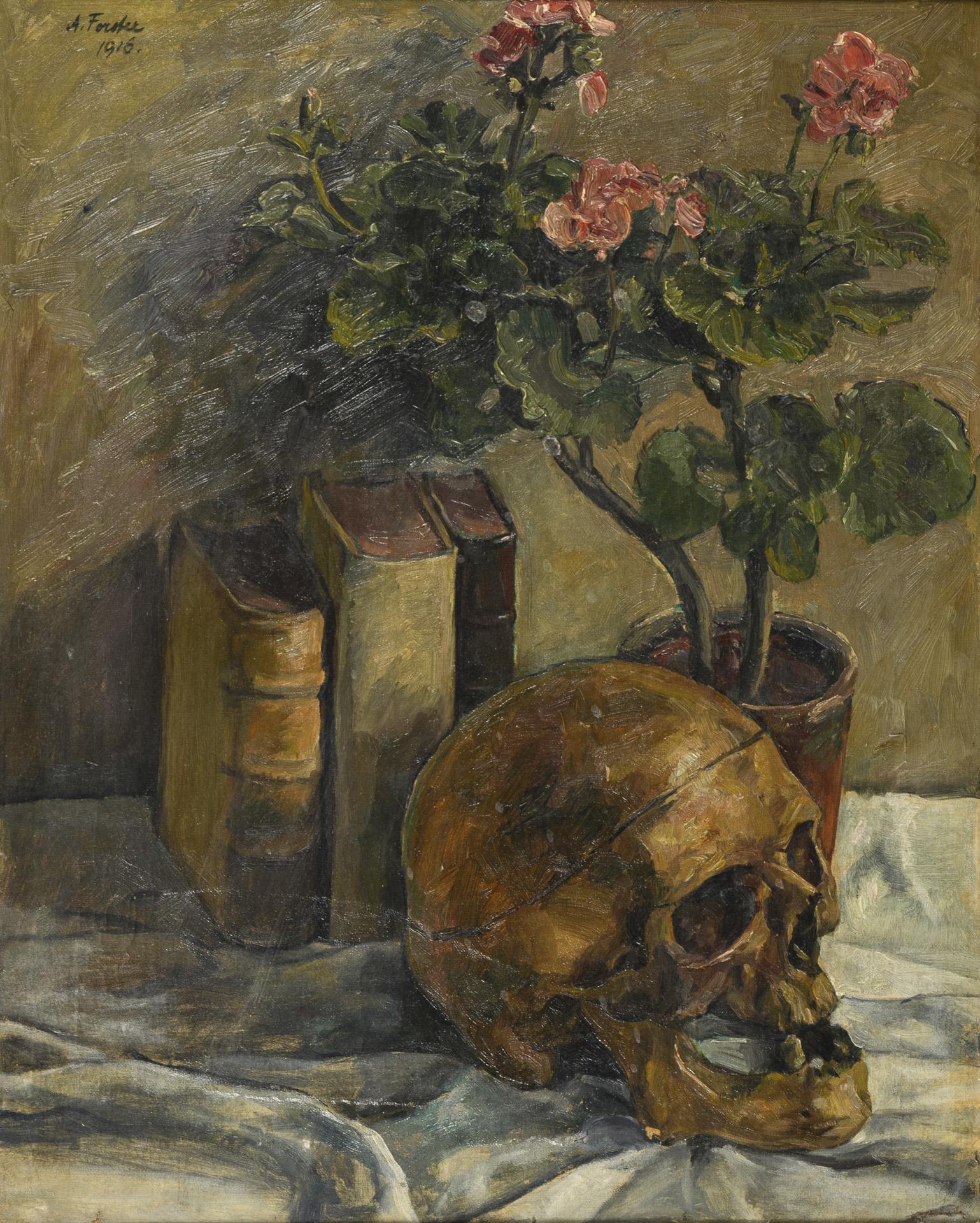 Totenschädel neben Topfpflanze und Büchern. Altersspuren.