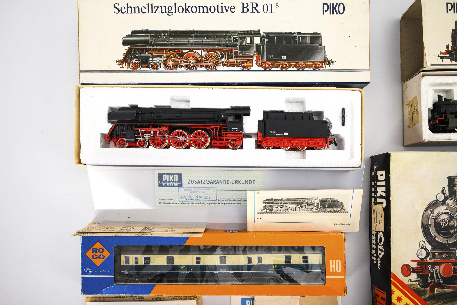 Spur H0. Piko-Odtimer "Länderbahn 1913", Modell der Güterzuglokomotive G8 der K.P.E.V. 6 x 33,5 x 22,5 cm. / Schnellzuglokomotive BR 01 und Schnellzuglokomotive BR 03 0-2 (Reko). 5,5 x 36 x 10,5 cm. / Güterzuglokomotive BR 55 25-56. 5,5 x 26 x 9 cm. / ROCO International Güterwagen 4262. Bespielt, 1 Achse lose. 4 x 34 x 8 cm. Funktion nicht geprüft.