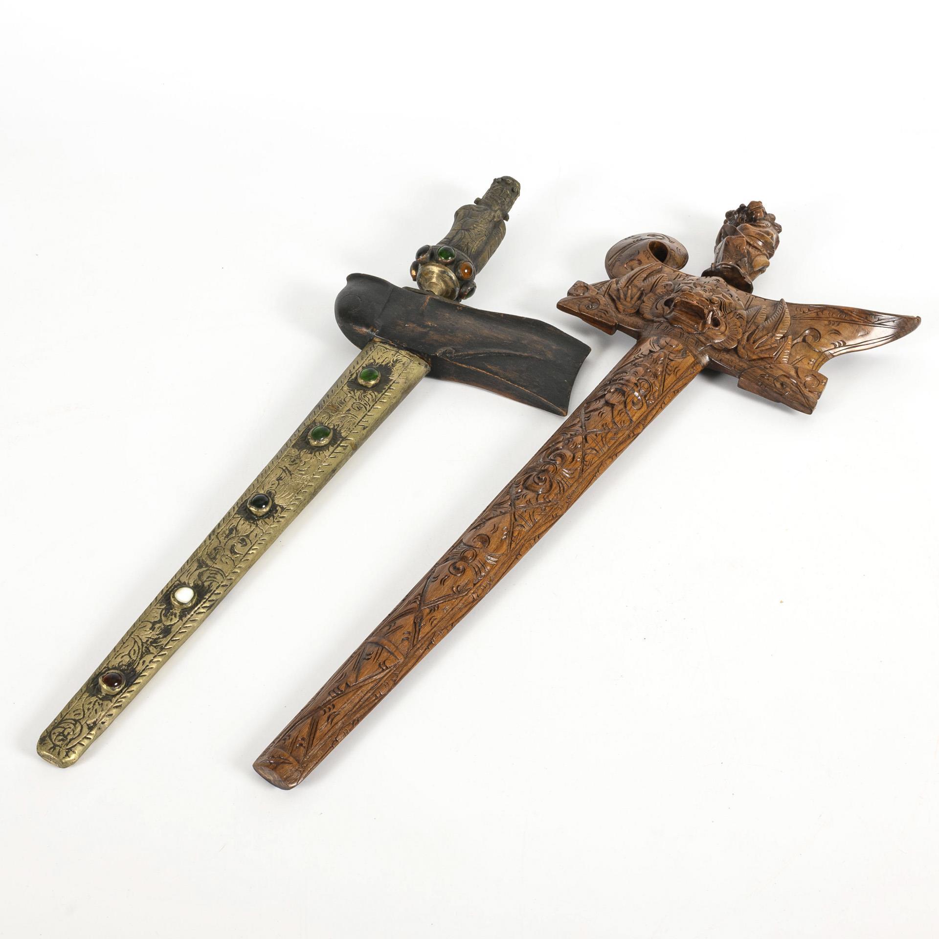 2 große Kris mit verzierten Scheiden.