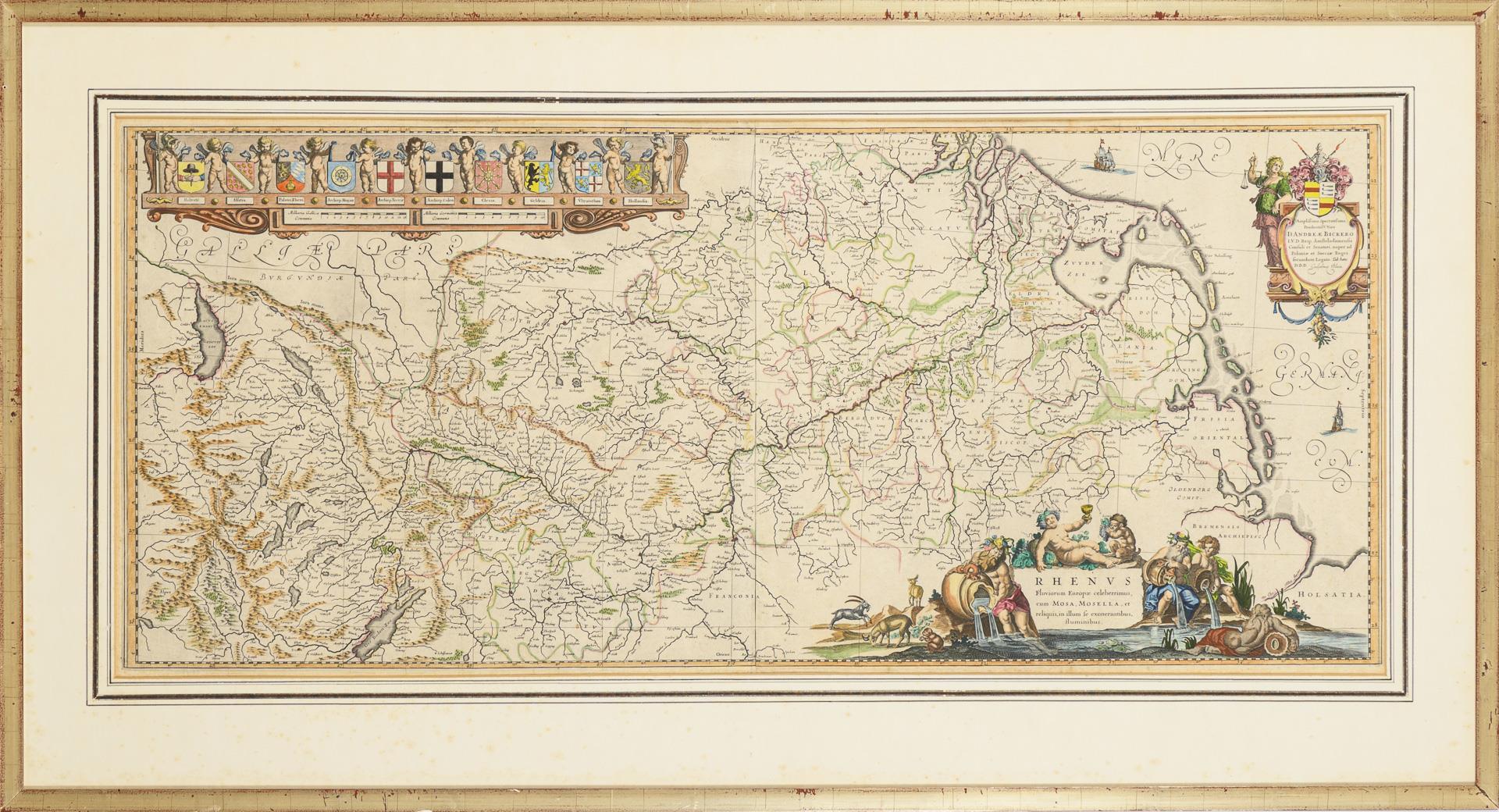 "Rhenus Fluviorum Europae celeberrimus cum Mosa, Mosella ..." von G. Blaeu. Passepartout etwas stockfleckig.