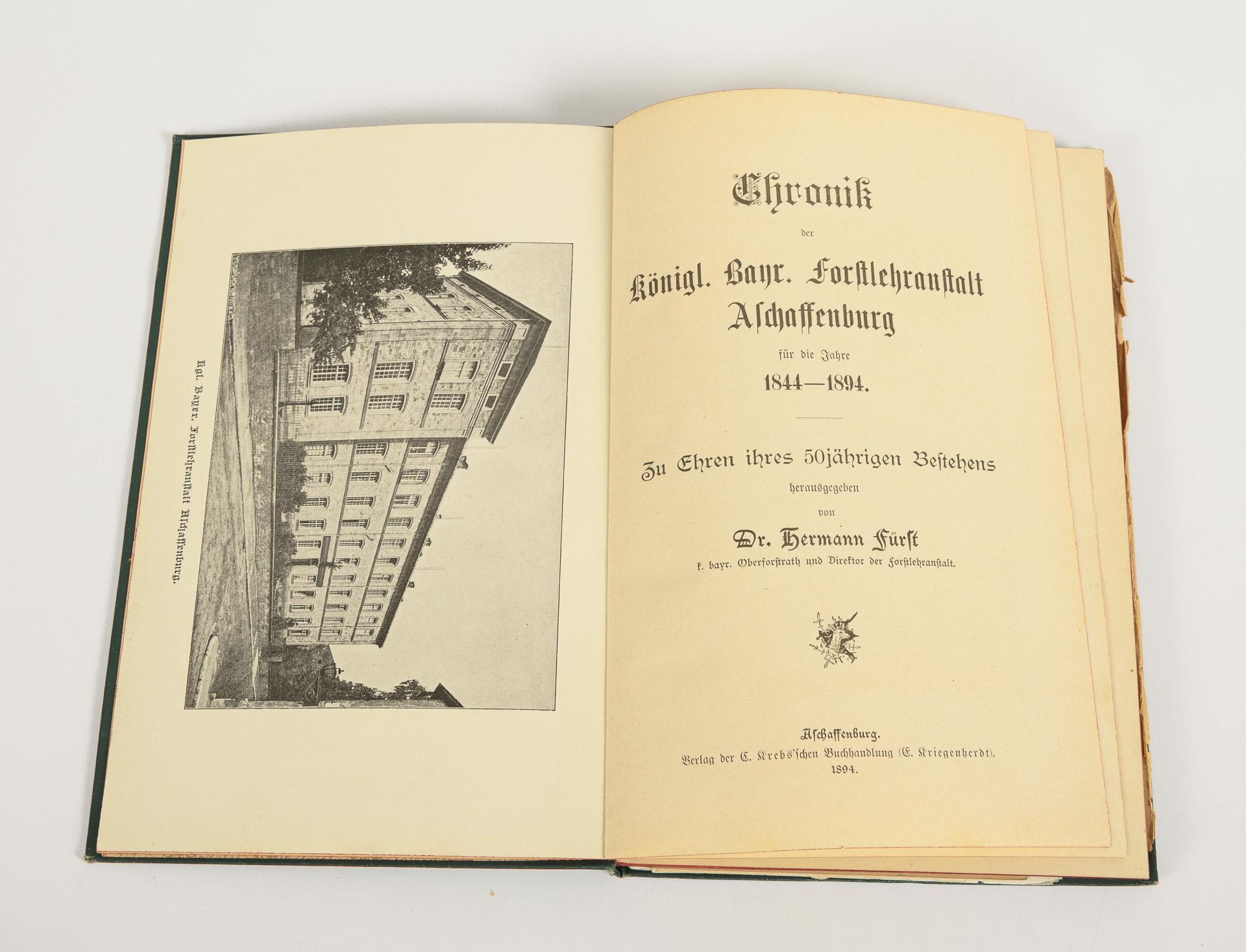 Fürst, Hermann: "Chronik der Königl. Bayr. Forstlehranstalt Aschaffenburg für die Jahre 1844 - 1894", Aschaffenburg 1894, 119 Seiten im geprägten Leineneinband. (23 x 15 cm) / Hohenadel: "Taschenbuch für Forstmaenner", Augsburg & Leipzig 1823. 47 Seiten und eine Tafel, im Pappeinband. (21 x 13 cm).