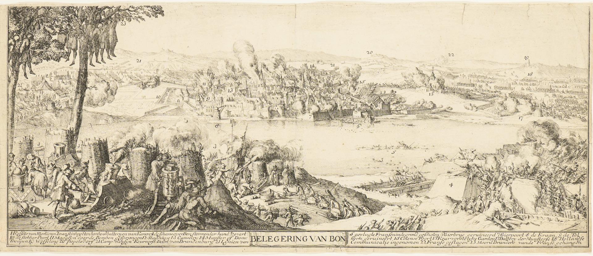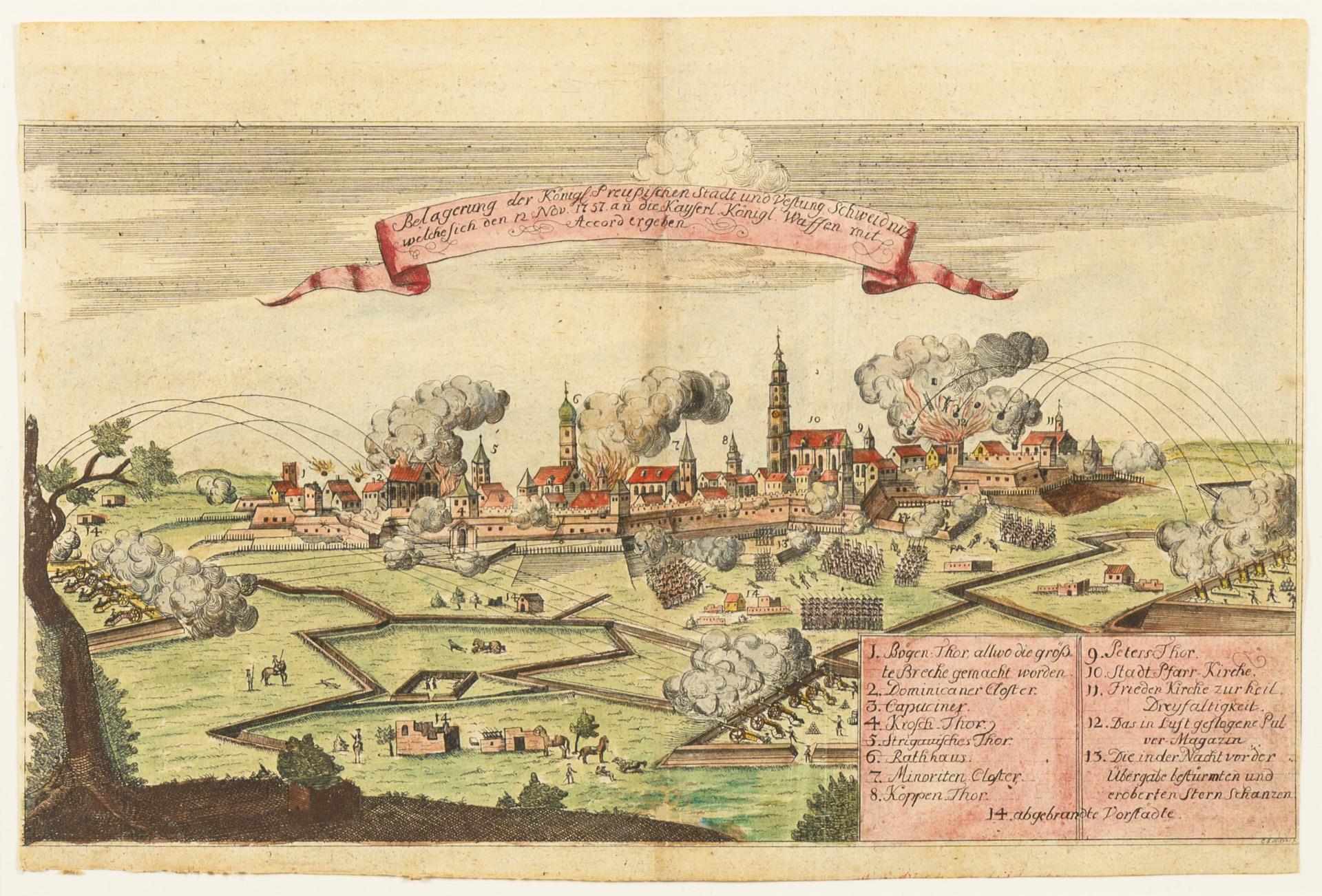 "Belegering van Bon", Kupferstich, (23 x 56 cm; Rahmen 43 x 76 cm) / "Belagerung der Königl. Preußischen Stadt und Vestung Schweidnitz ...1757", kolorierter Kupferstich, (17 x 30 cm; Rahmen 39 x 45 cm).