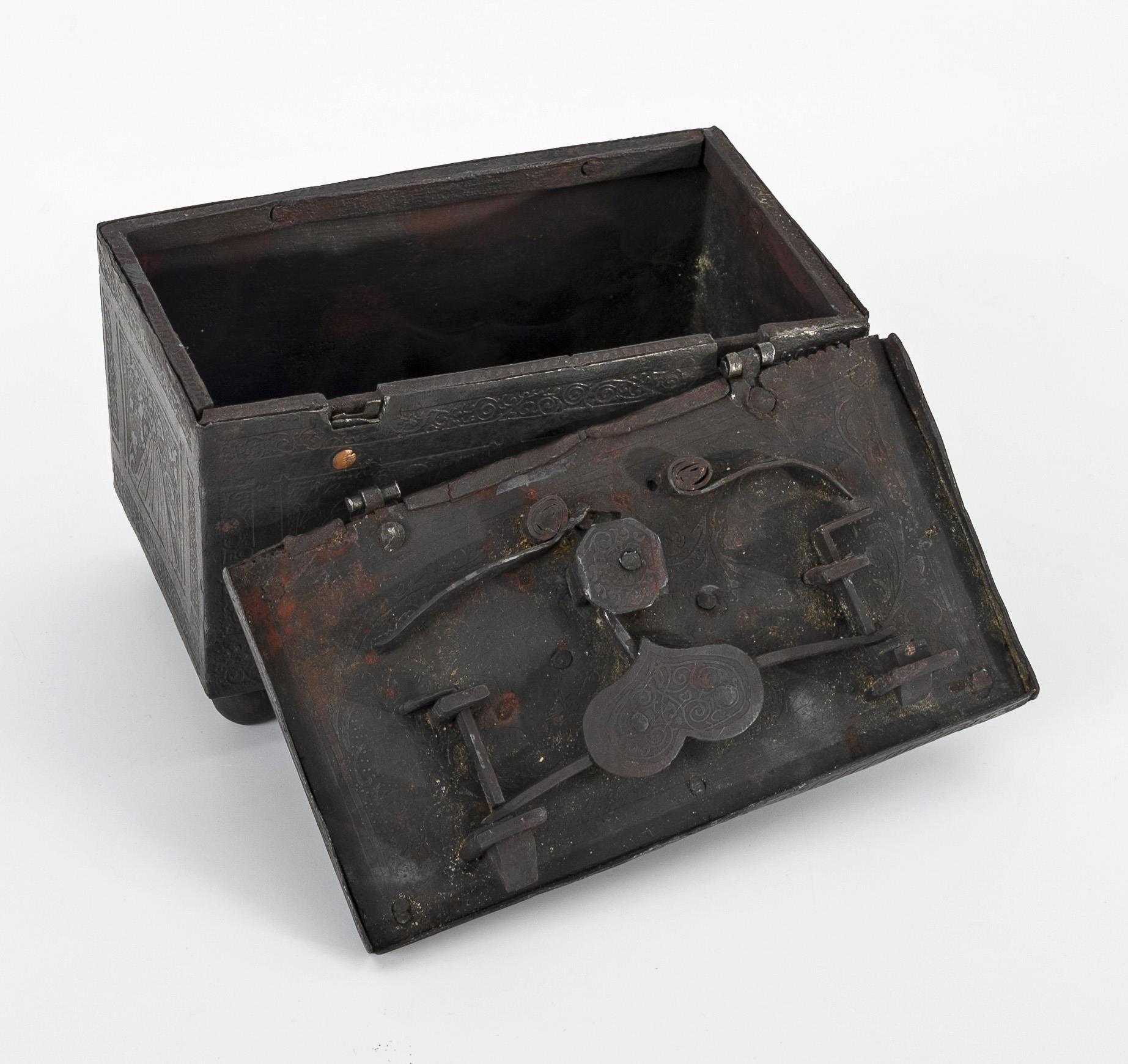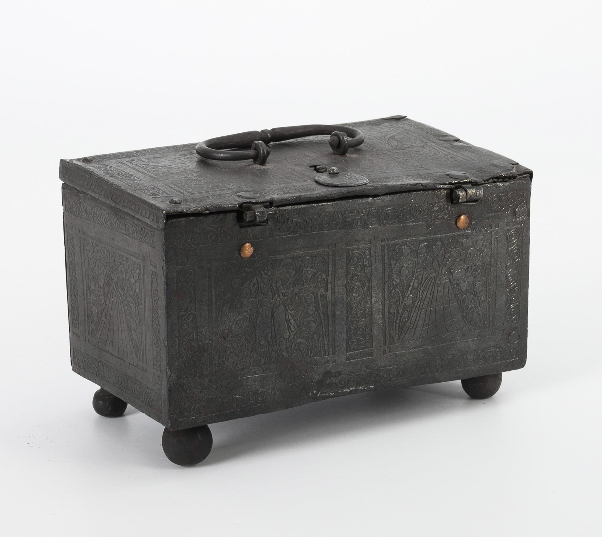 Quaderförmige Eisenschatulle (Minnekästchen) mit Kugelfüßen sowie beweglichem Tragegriff und verdecktem Schlüsselloch auf dem Scharnierdeckel. Allseits und auf dem Scharnierdeckel reiches Ätzornament mit Rankenrahmung um die Bildfelder mit je einer Dame bzw. einem Herren. Im Deckel schlichtes Schloss mit 2 beweglichen Fallen sowie Ätzornament. 1 Scharnier gebrochen, geringe Fehlstellen am Deckel, 1 Fuß ergänzt, einige Alters-/Gebrauchsspuren.