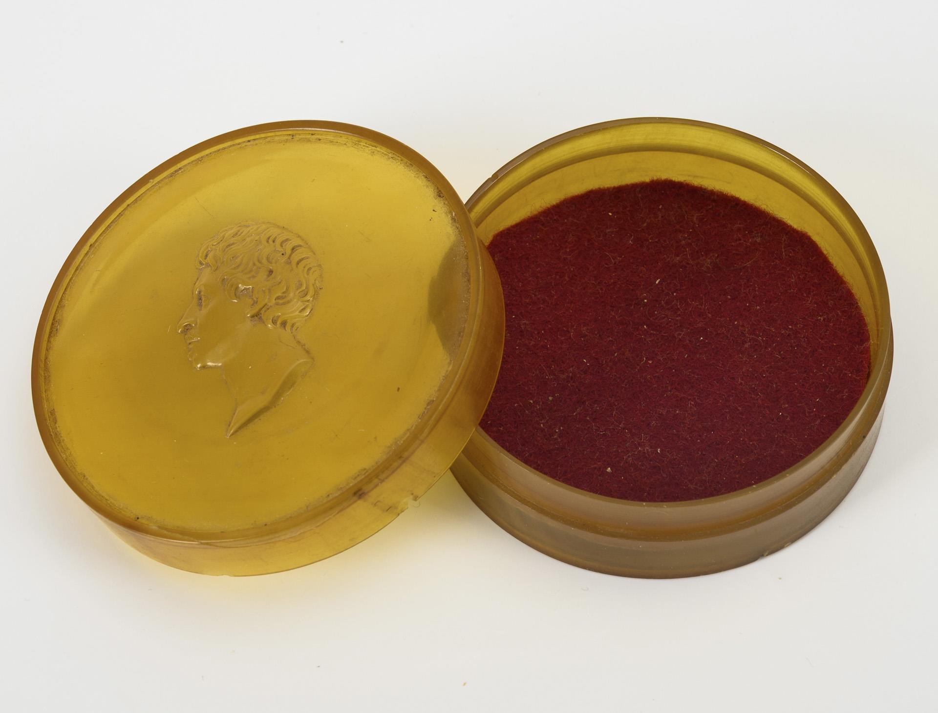 Runde Dose mit Passdeckel, auf dem Deckel Bildniskopf eines jungen Mannes. Kleine Abplatzer an den Rändern, 1 unauffälliger kleiner Haarrisse am Deckelrand.
