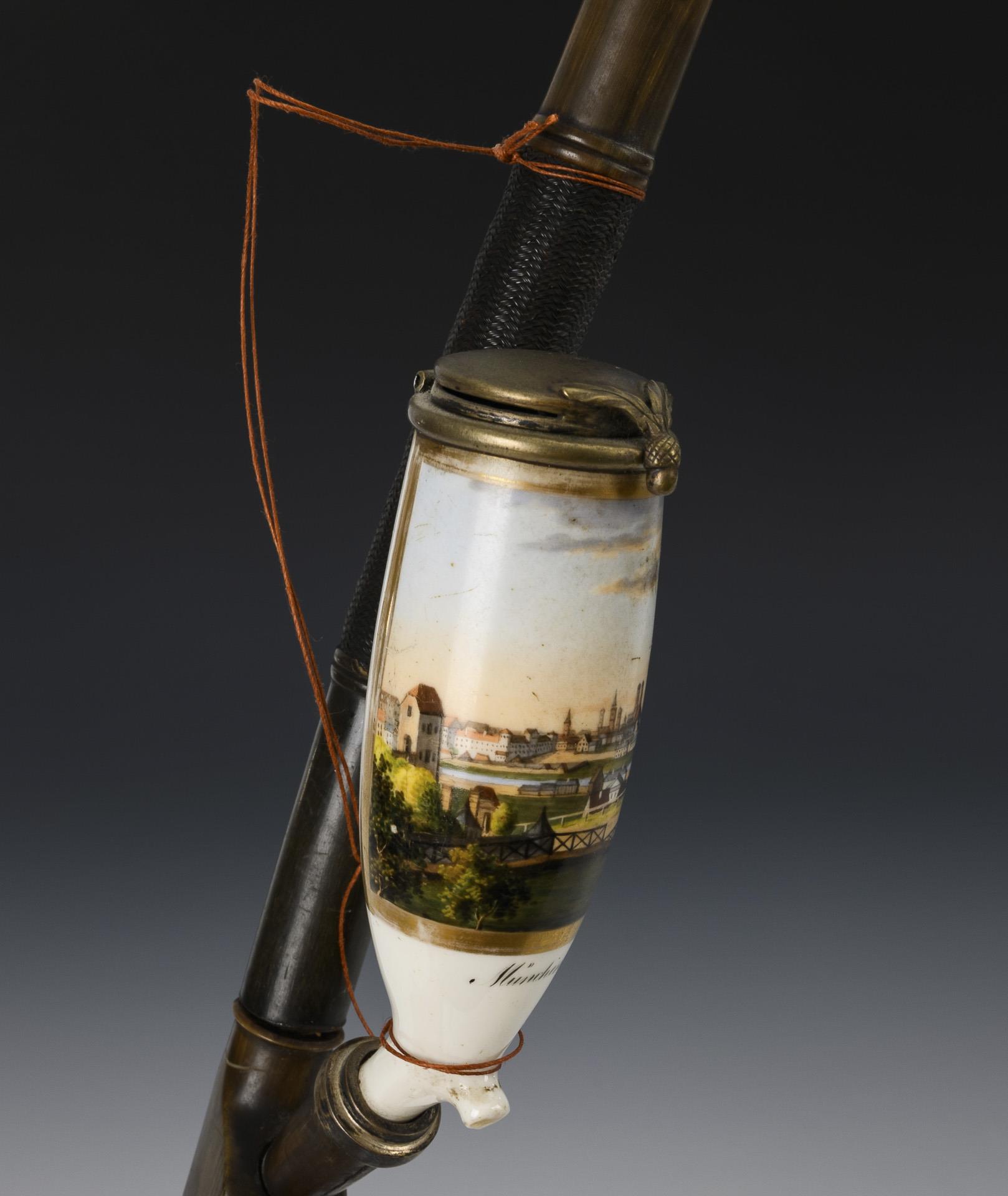 1x mit der bezeichneten Ansicht von München, verso die Widmung "Trau seinem Schüchler 1839". / 1x mit der Darstellung eines Reiters in Uniform. Beide mit metallmontiertem Scharnierdeckel und Holzholm. Gold teils berieben, teils Kratzspuren.