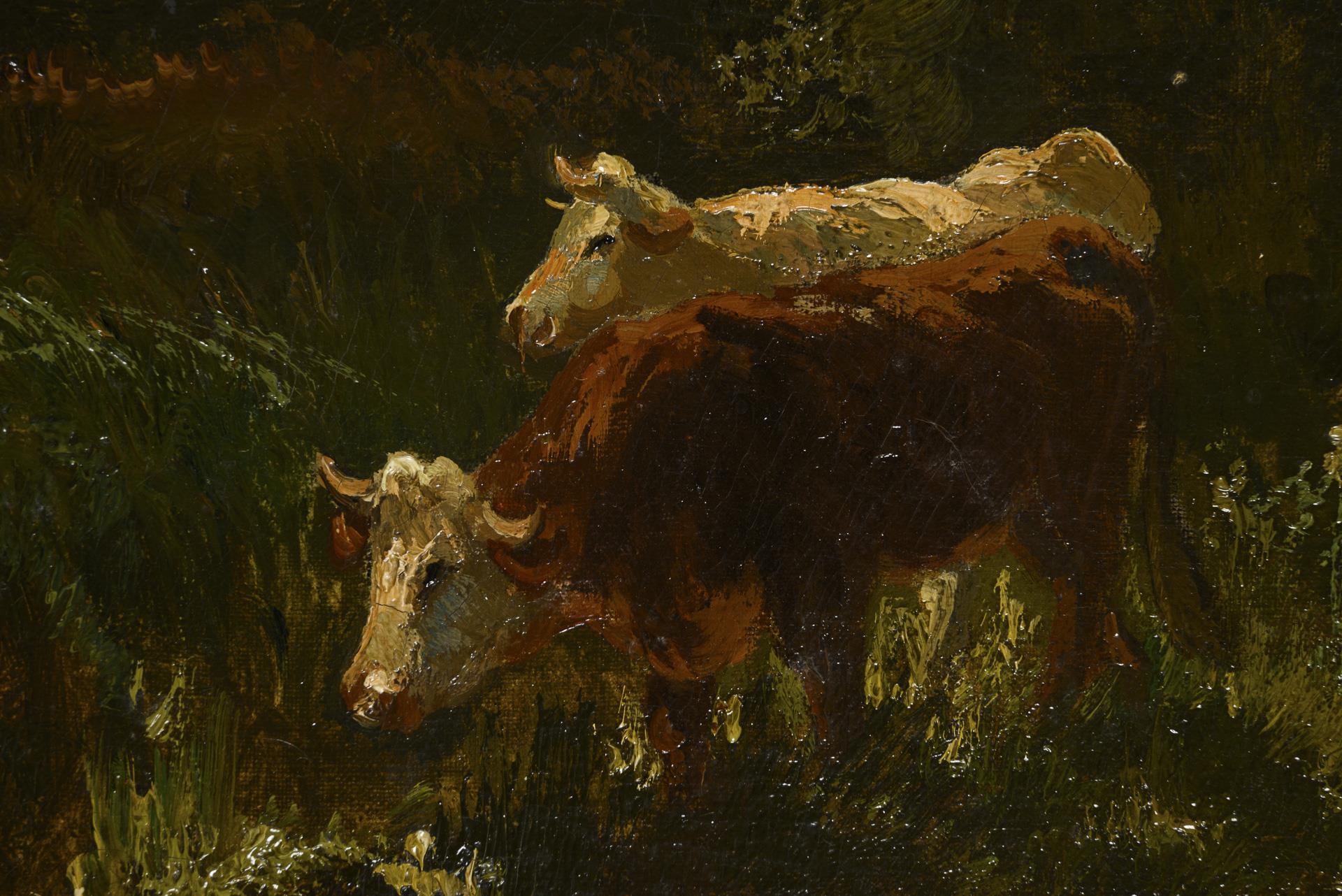 Die Tiere nahe dem Dorf im seichten Ufer des Flusses am Abend. Eine restaurierte Stelle mit Hinterklebung.