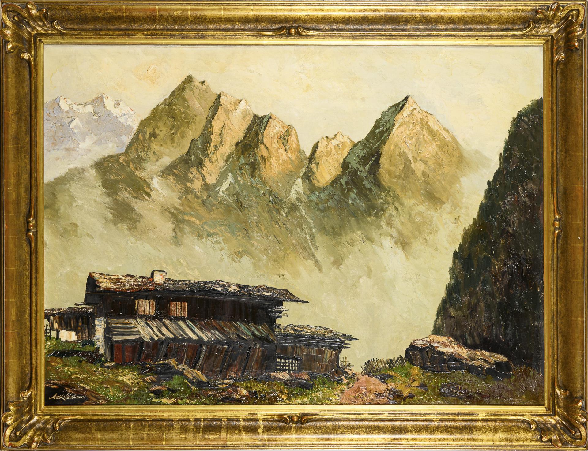 Teils pastos gemalte Gebirgslandschaft mit Alpenhaus an einer nebligen Schlucht vor den Gipfeln.