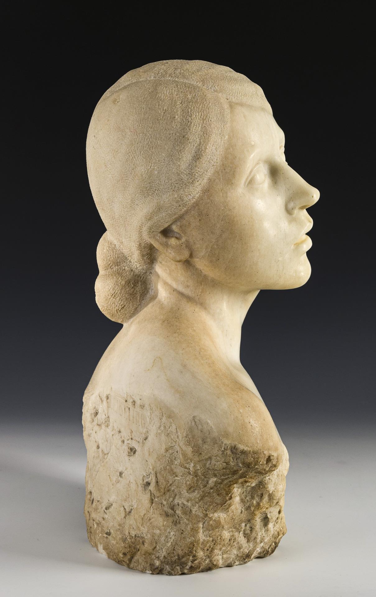 Bildnis einer leicht zur Seite aufblickenden aparten Schönheit mit Haarknoten im Nacken. Reizvoll ist der Kontrast zwischen naturbelassenem "Sockel" und den fein geglätteten Hautpartien. 1 Ohr geklebt, 1 kleine Vertiefung am Haar.