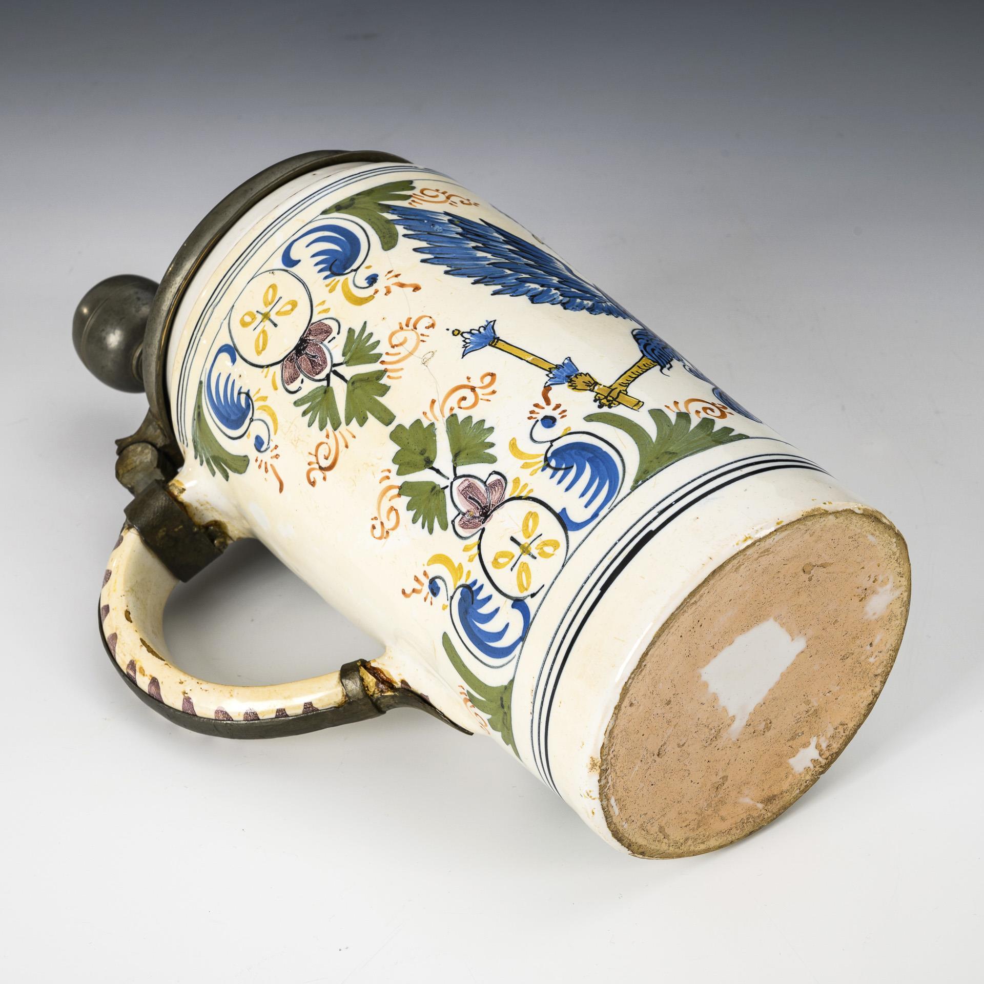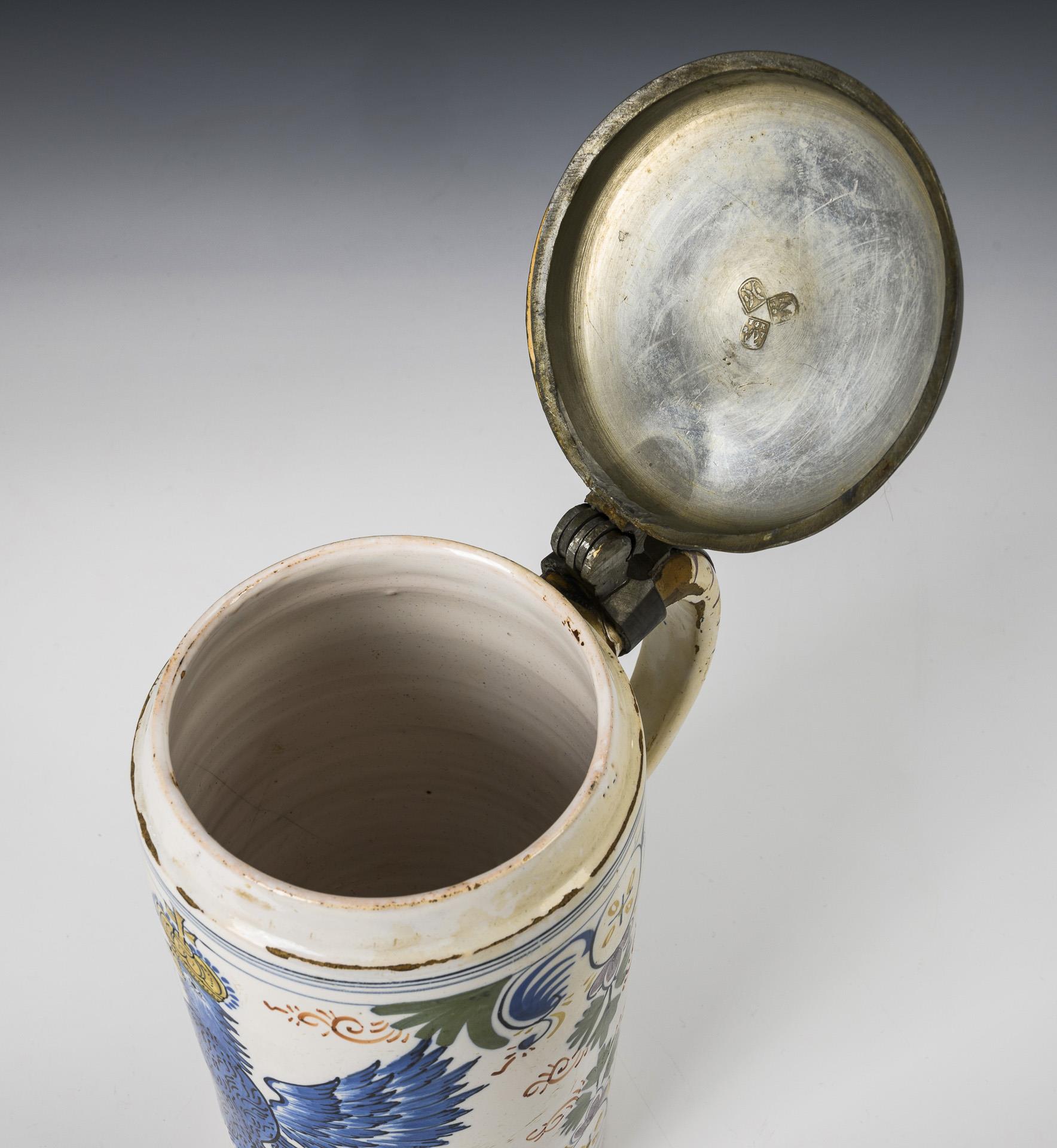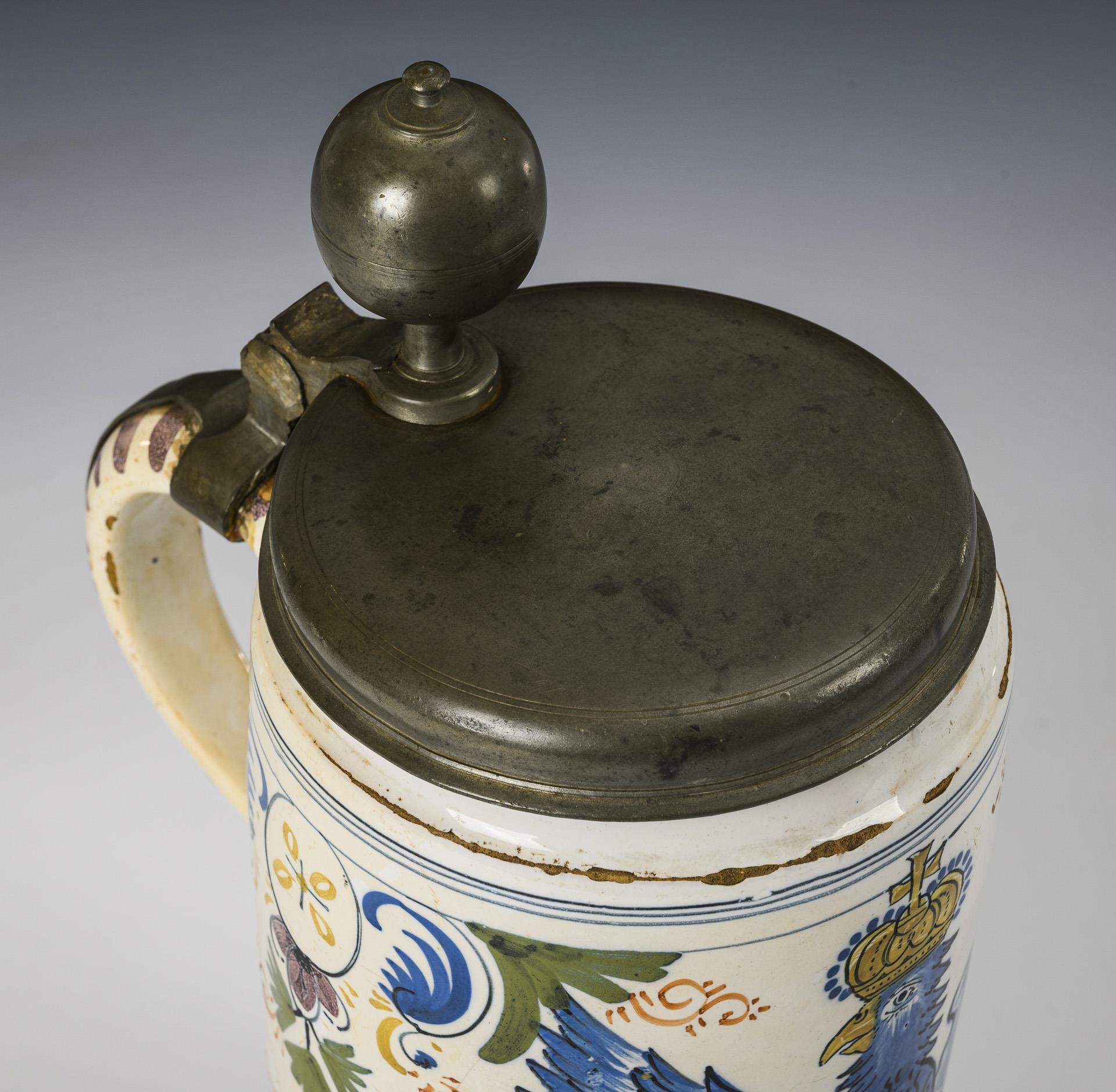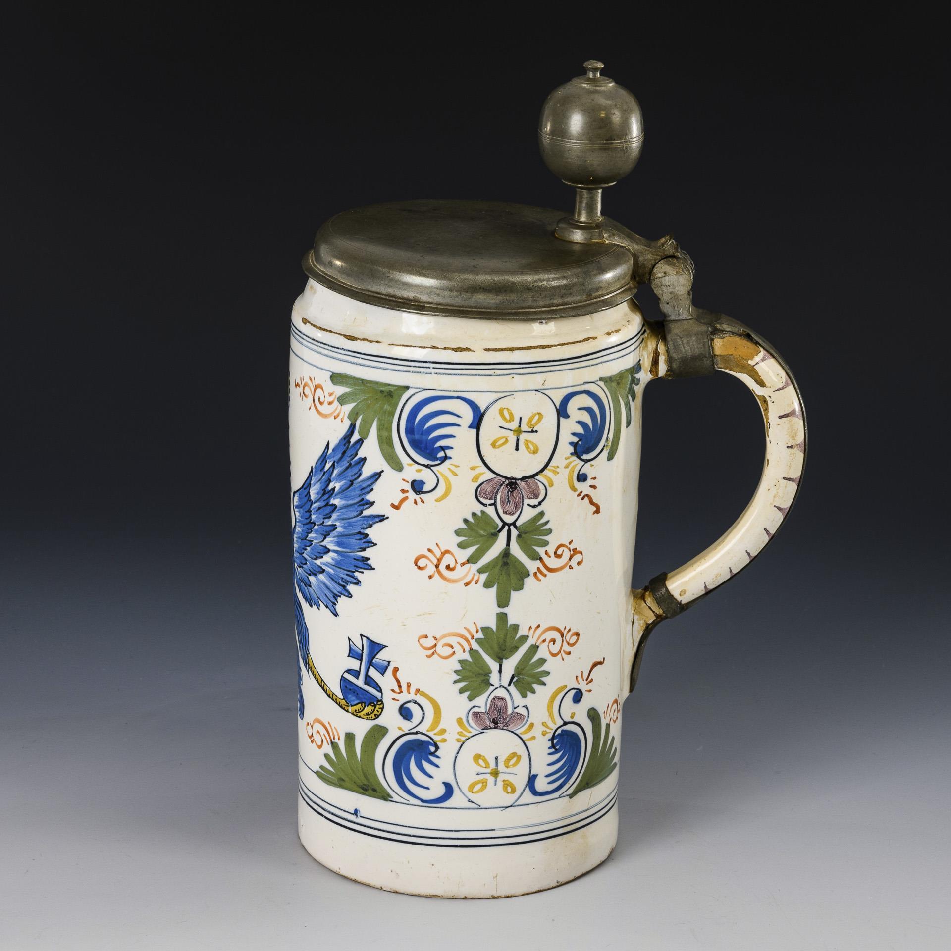 Zylindrischer Korpus mit strichverziertem Bandhenkel, schauseitig der bekrönte Adler mit Reichsapfel und Zepter, flankiert von Blumenbändern. Zinndeckel mit Kugeldrücker, innen gepunzt, Zinnband am geklebten Henkel. Haarrissig, Glasurdefekte und Bereibungen.