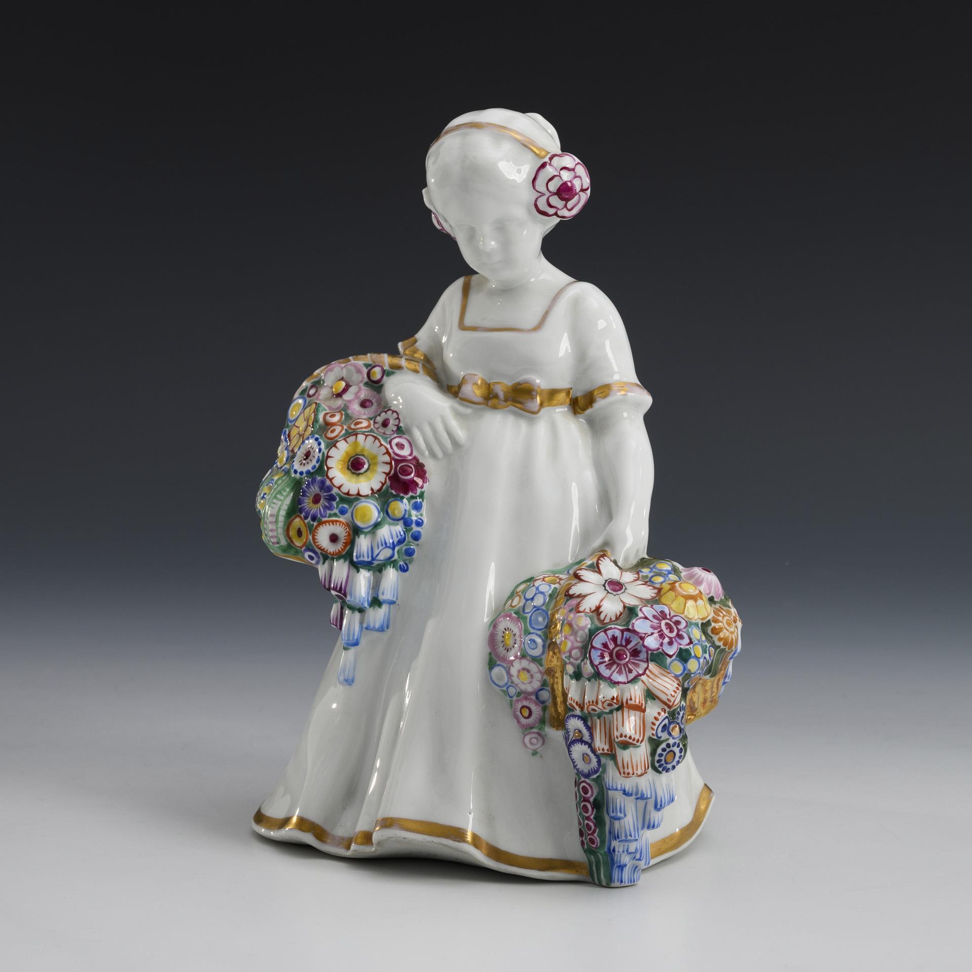 Stehendes Mädchen, zwei große Blumenkörbe tragend. Gold etwas berieben.
