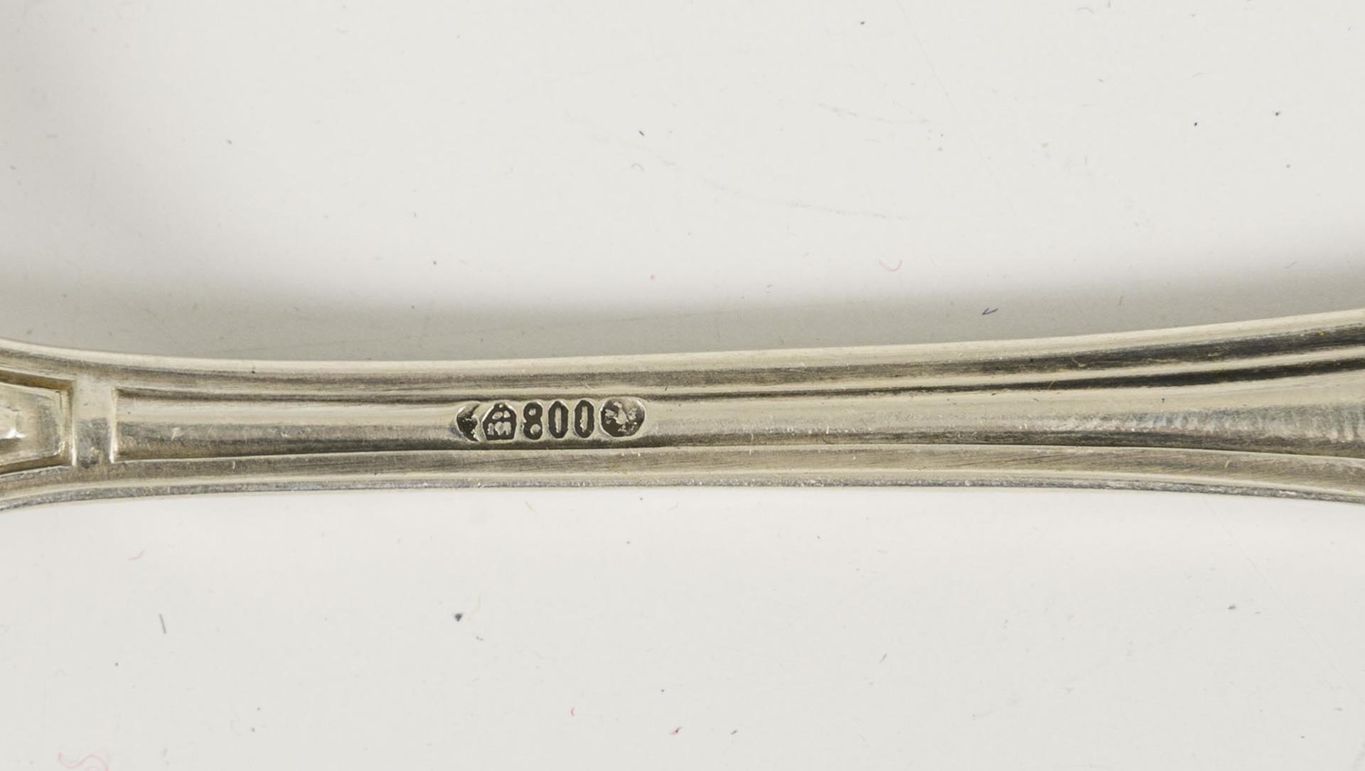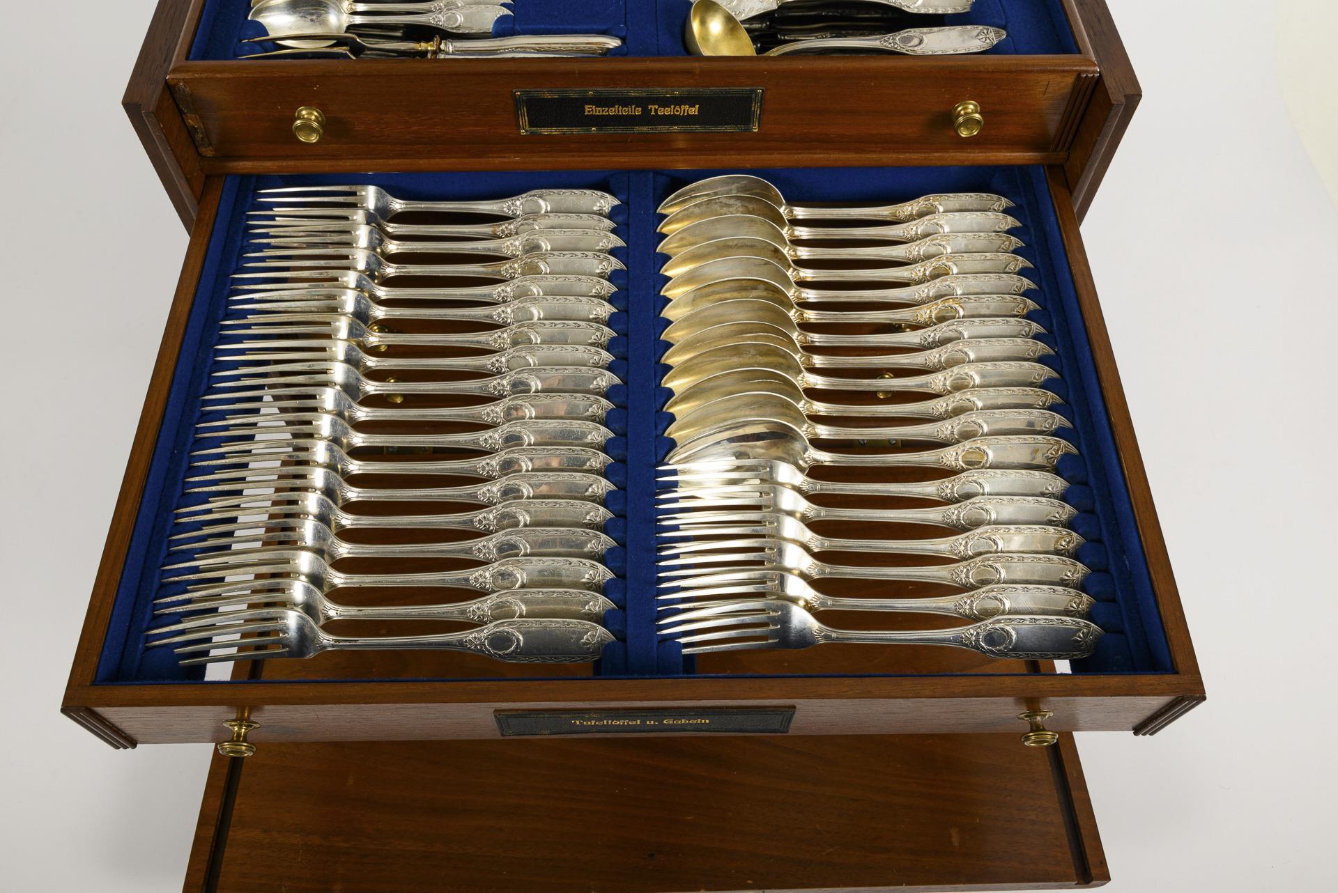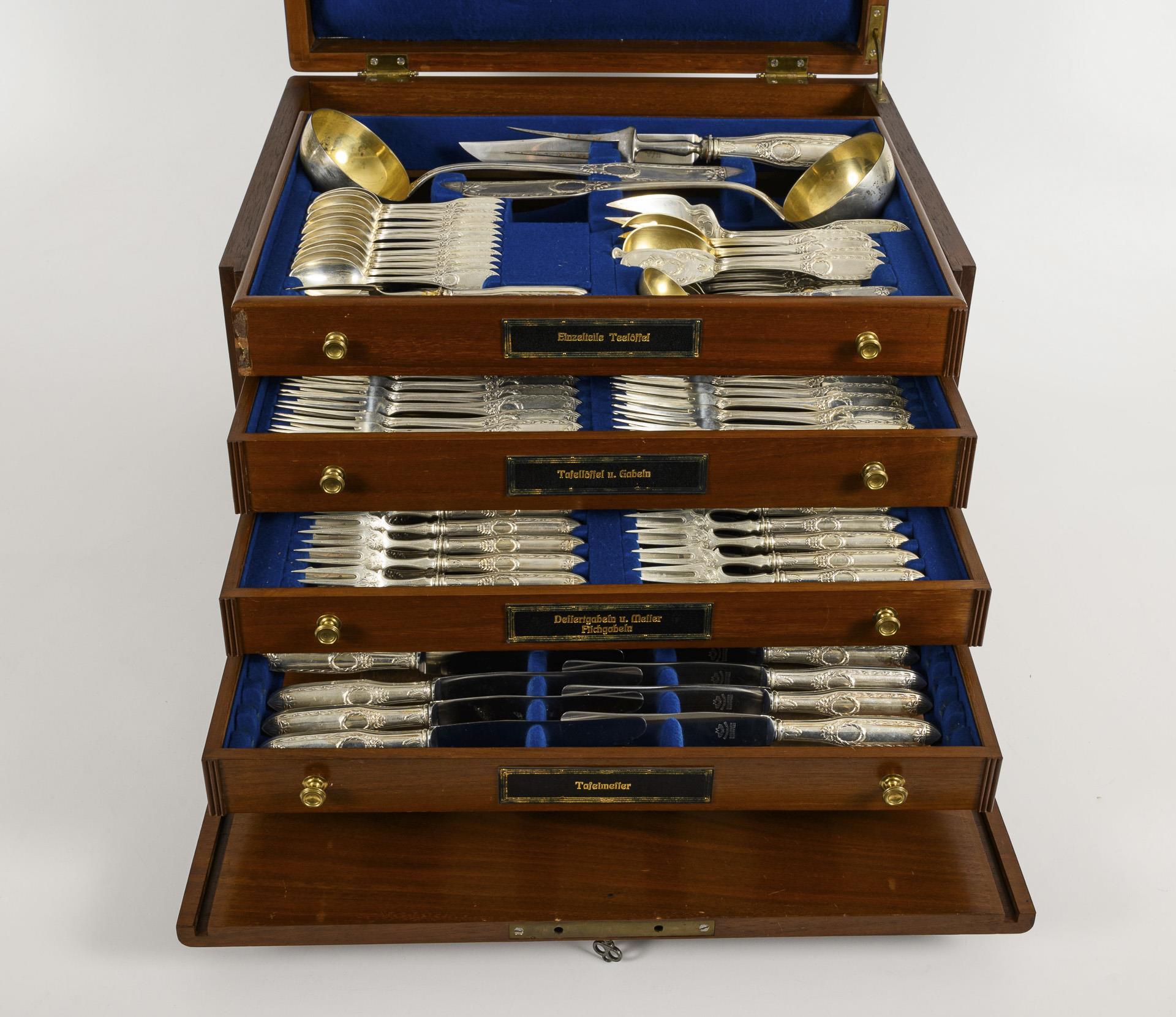 120 Teile. Dekor mit Lorbeerkranz-Reliefs. 24 Menügabeln, 24 Menümesser, 12 Suppenlöffel, 12 Dessertgabeln, 12 Dessertmesser, 12 Kuchengabeln, 12 Kaffeelöffel, 12 Vorlegeteile. Als Zugabe 4 Vorlegeteile mit anderem Muster (teils versilbert). Gewicht ca. 4400 g (ohne Messer). Teils mit Gebrauchsspuren, Trockenriss im Deckel des Kastens.