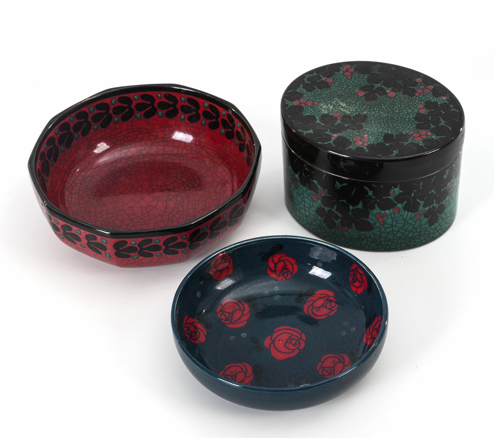 Grüne ovale Dose mit flachem Deckel und Weinlaubdekor (H 11 cm), rote Rundschale mit 10-fach geplatteter Wandung und Blattfries (Ø 21 cm), blaue Rundschale mit rotem Rosem (Ø 17,5 cm). Minimale Glasurchips.