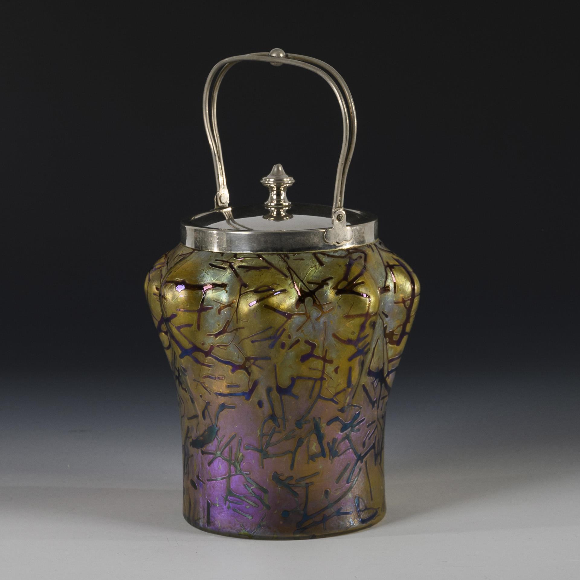 Farbloses Glas mit silbergelben Kröseleinschmelzungen und violetten Stäbchensplittern, irisiert. H ohne Henkel 16 cm, H gesamt 25 cm.