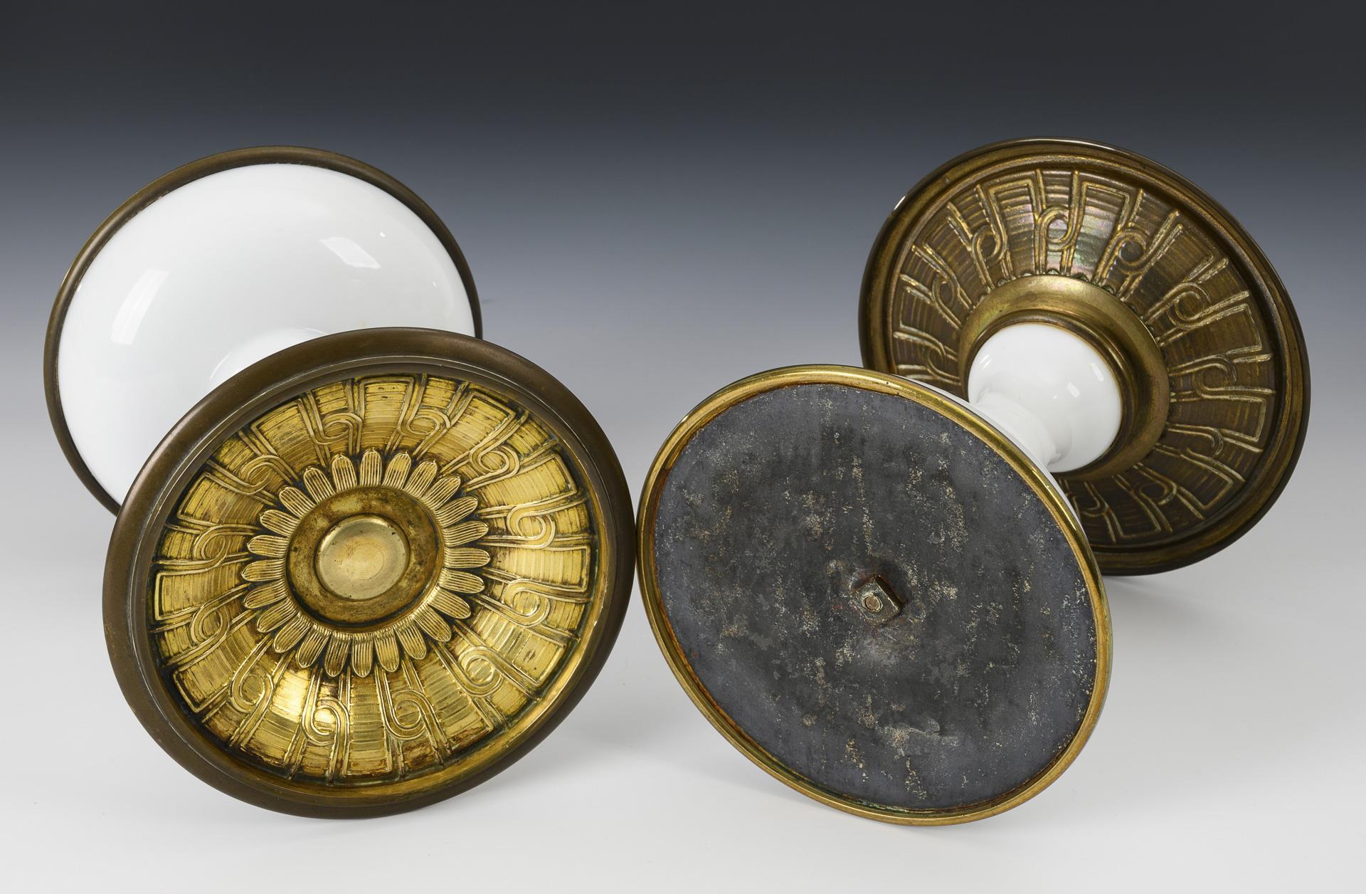 Milchglas, Messingblech teils geprägt mit goldfarbenem Überzug, Bodenplatte Eisenblech. H 19 cm, Ø 16,5 cm.