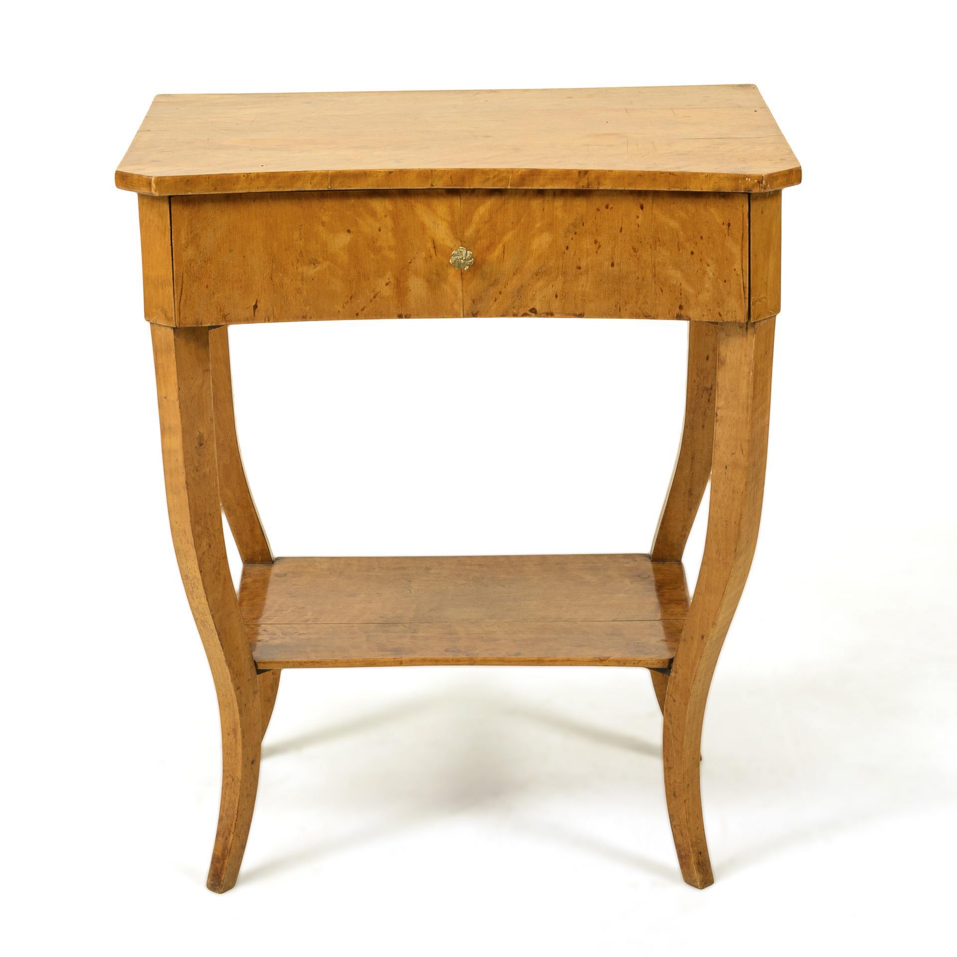 1-schübiger Beistelltisch mit konkaver Plattenfront und Schub, rechteckige Deckplatte mit frontseitig geschrägten Ecken, auf 4 konkav gebogten Spitzbeinen mit Zwischenablage. Floraler Messingknauf. Restauriert, Alters- und Gebrauchsspuren.
