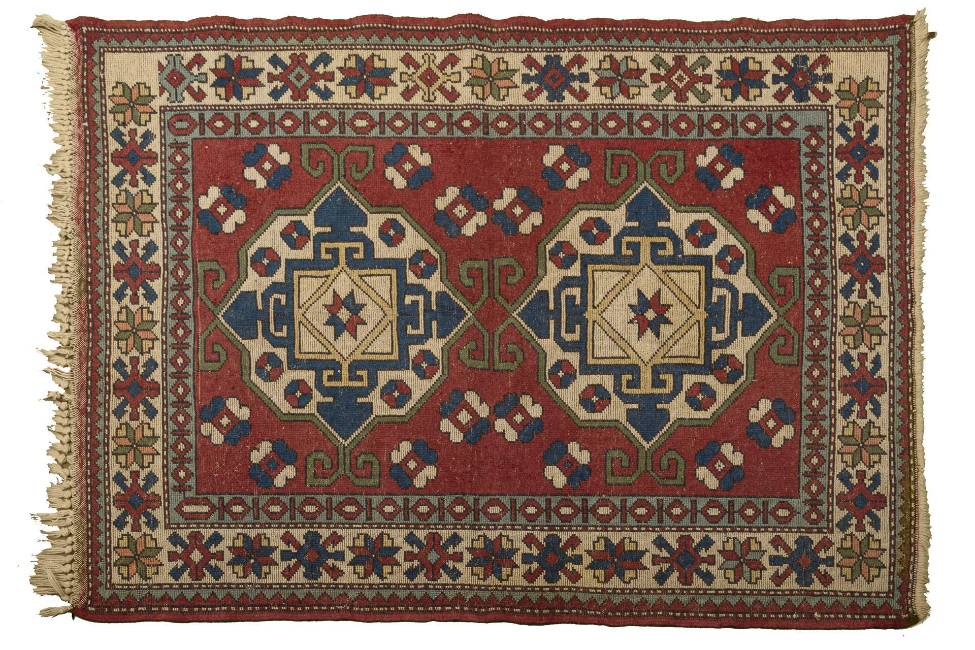 Rotgrundiges Mittelfeld mit 2 großen, hakenbesetzten Medaillons, umgeben von einzelnen Blüten. 3-reihige Bordüre mit alternierenden Sternblüten, geknotete Fransenabschlüsse. Alters- und Gebrauchsspuren, Flor und Fransenabschlüsse mit leichten Defekten, teils repariert, leicht verschmutzt.