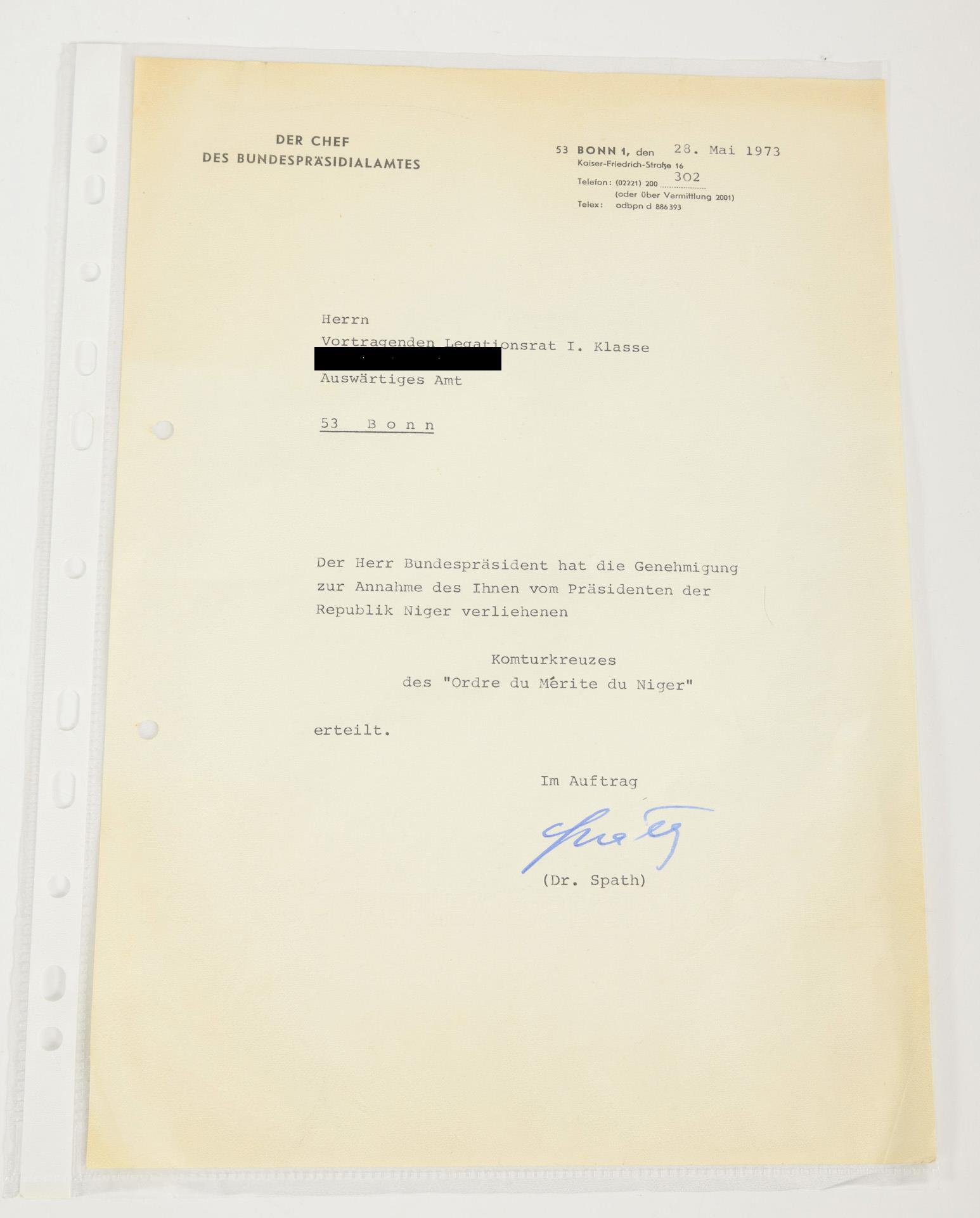 Orden am Halsband, Anstecknadel und Schreiben des Bundespräsidialamtes der BRD..