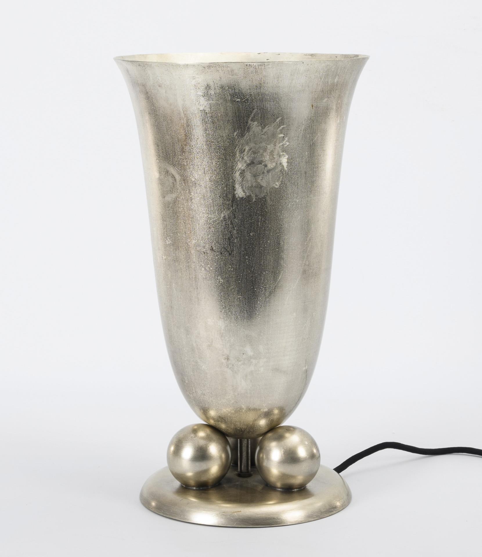 Messing mit silberfarbenem Überzug, Elektrifizierung mit 1 Schraubfassung. H 47,5 cm, Ø 27 cm. 2,9 kg.