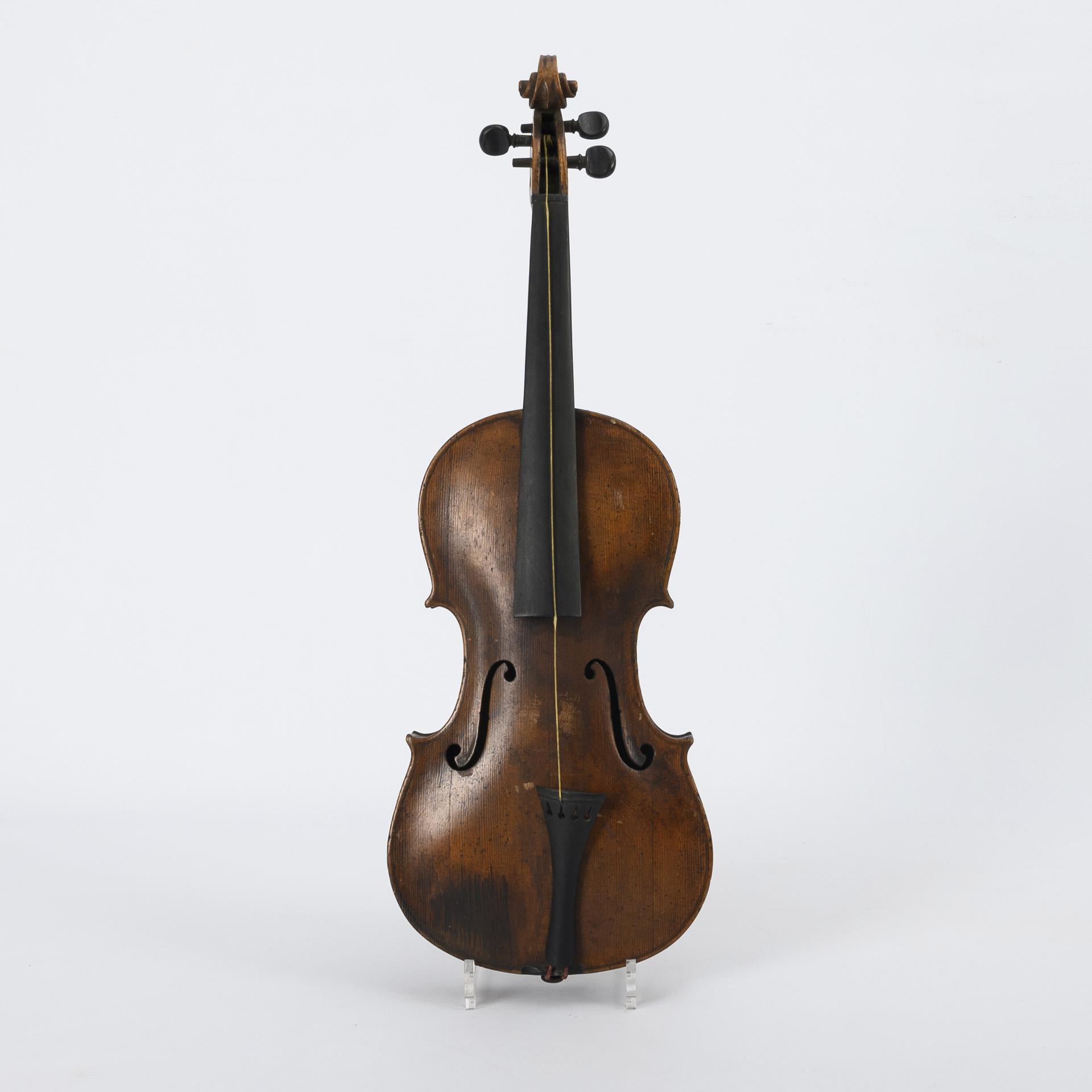 Violine mit ungeteiltem und geriegeltem Boden. Beiliegende Kinnstütze und Feinstimmer. Alt geklebte Deckenrisse, Schrammen an der Decke und am Bodenlack, 1 Saitenwirbel und Steg fehlen. 1 Bogen minimal verzogen und mit defekter Wicklung, 1 Bogen mit fehlendem Daumenleder, Wicklung und Froschauge. Defekter Koffer.