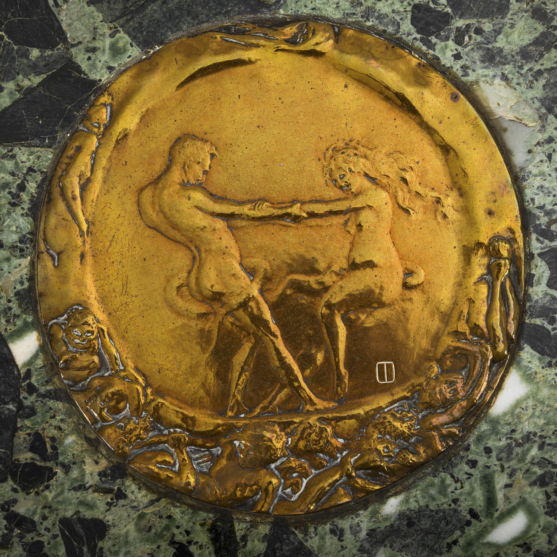 Tondo mit ausgelassen tanzendem Paar (Adam und Eva?), die durch eine Schlange verbunden sind. Am Rand weitere Figuren als Rahmung. Wohl vom Ringeltanz des Franz von Stuck inspirierte Darstellung. Abplatzer am Marmor.