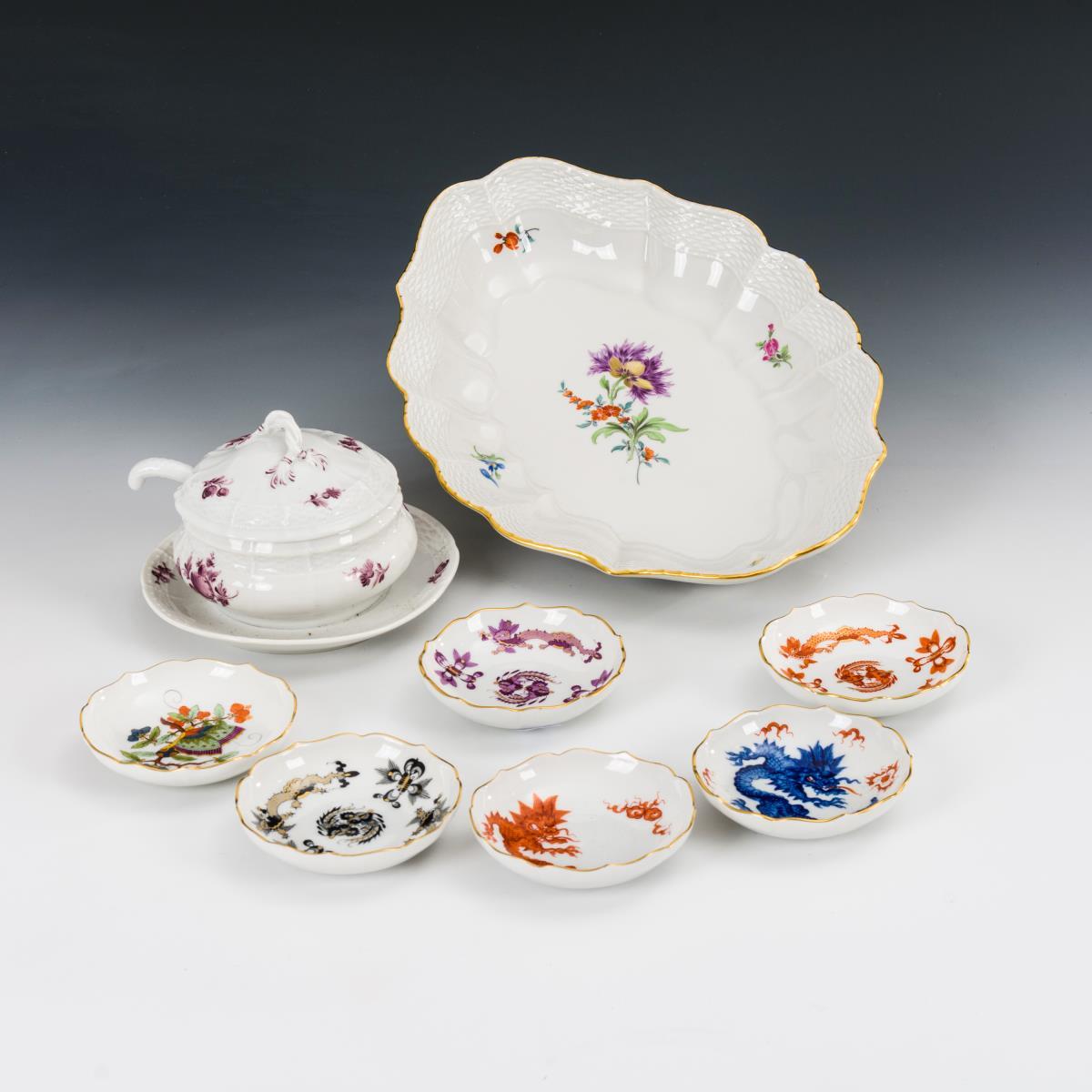 1 + 7x Meissen, 1. Wahl und 2 Schleifstriche: Ovalschale mit Altozierrelief (L 26,5 cm) und 6 Konfektschälchen mit indianischen Motiven (Ø 8 cm). / 1x Nymphenburg: Konfitürendose mit Altozierrelief, festem Unterteller, Löffelchen und Purpurmalerei (Ø 13 cm). Bestoßung am Schalenrand.