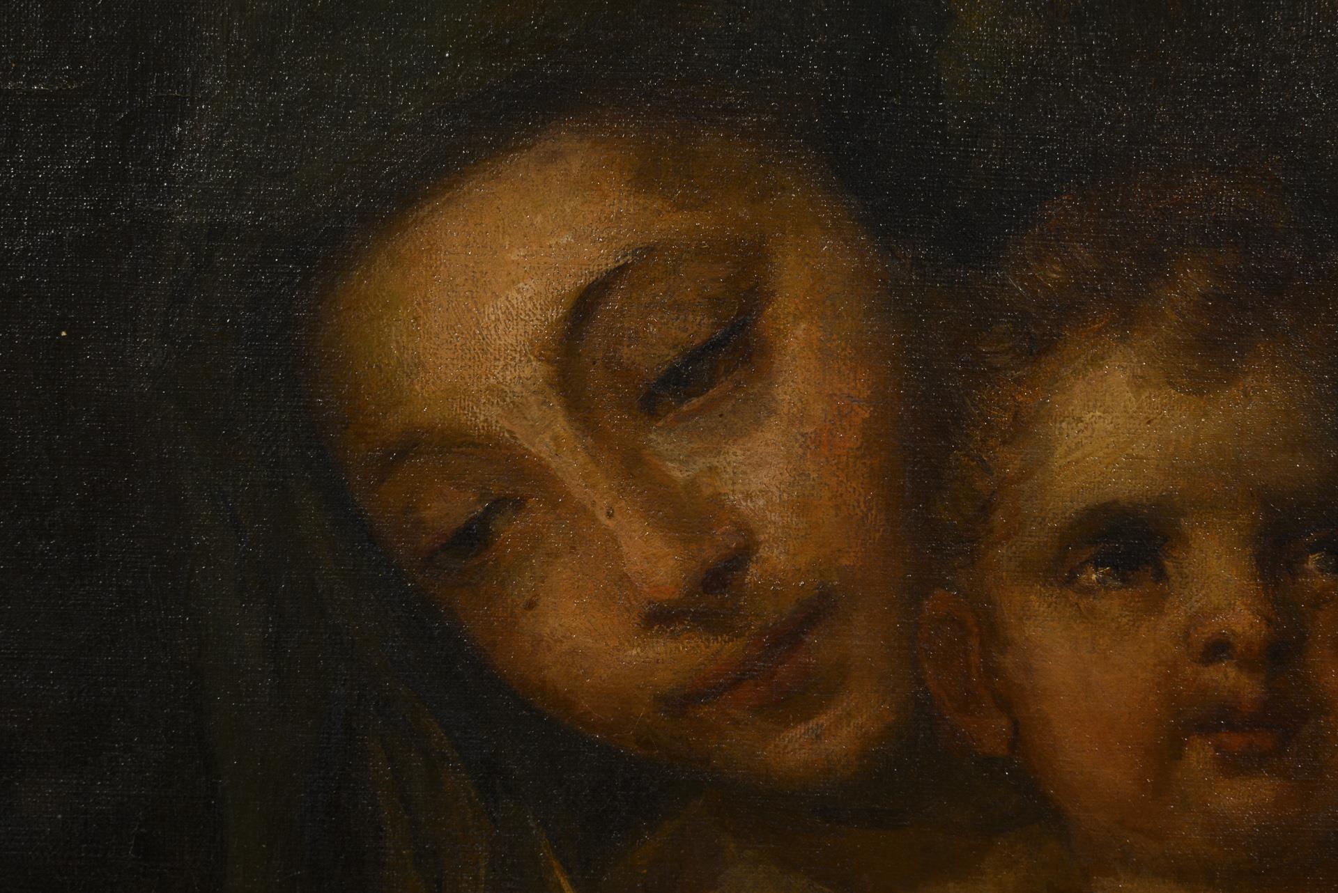 Maria mit dem Jesuskind auf dem Schoß nebst einem Mädchen. Farbabsplitterungen.