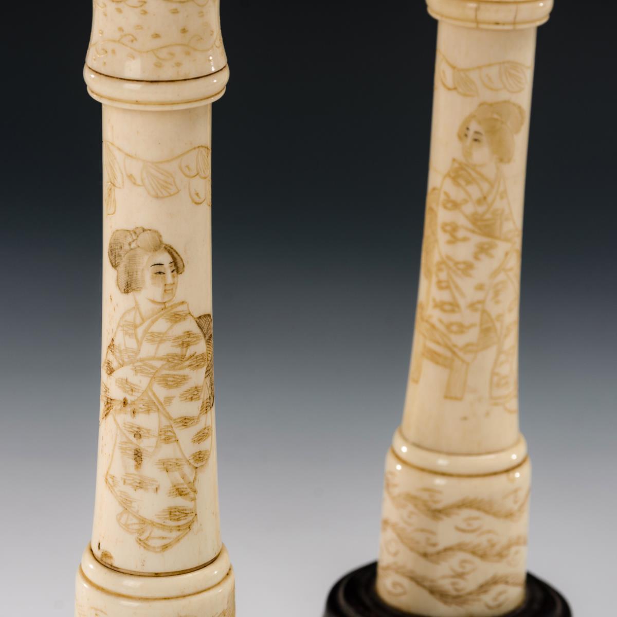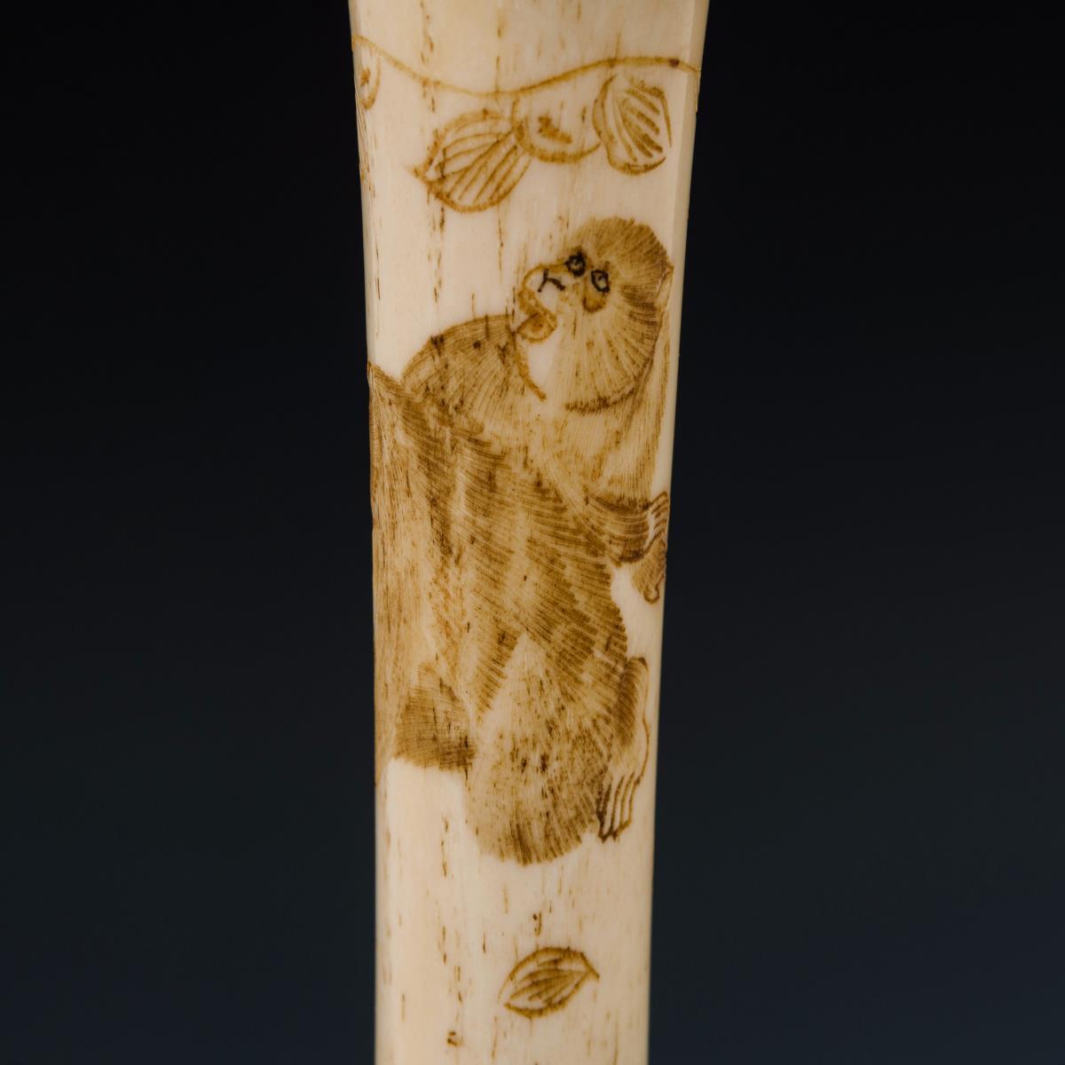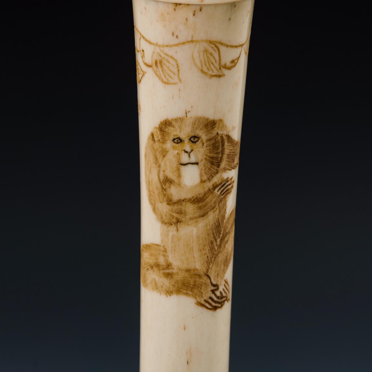 Durch gedrechselte Gewinde verbundene Einzelteile mit zarter Bildgravur von Affen und Frauen. Innentülle mit Doppelrand . Alters- und Gebrauchsspuren.