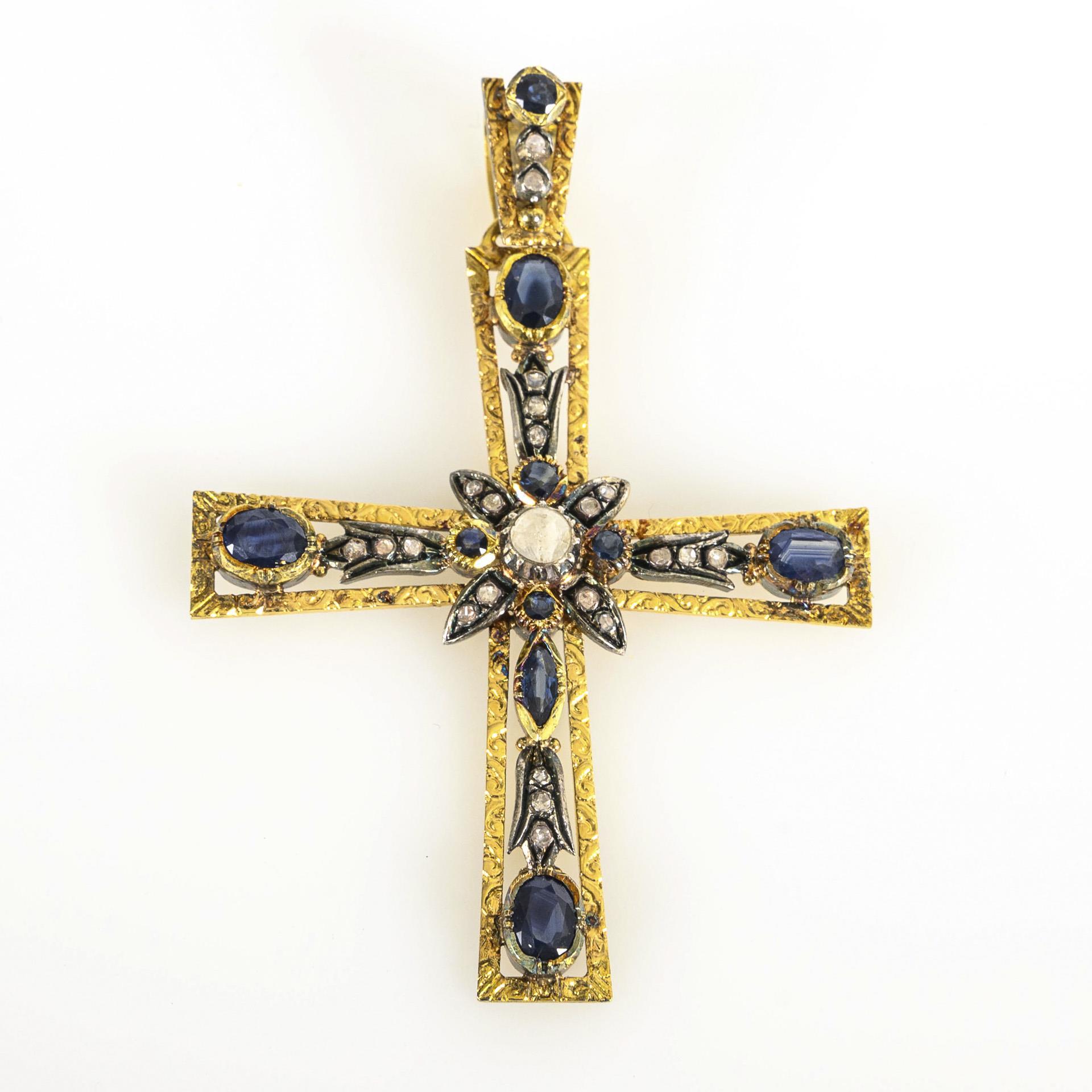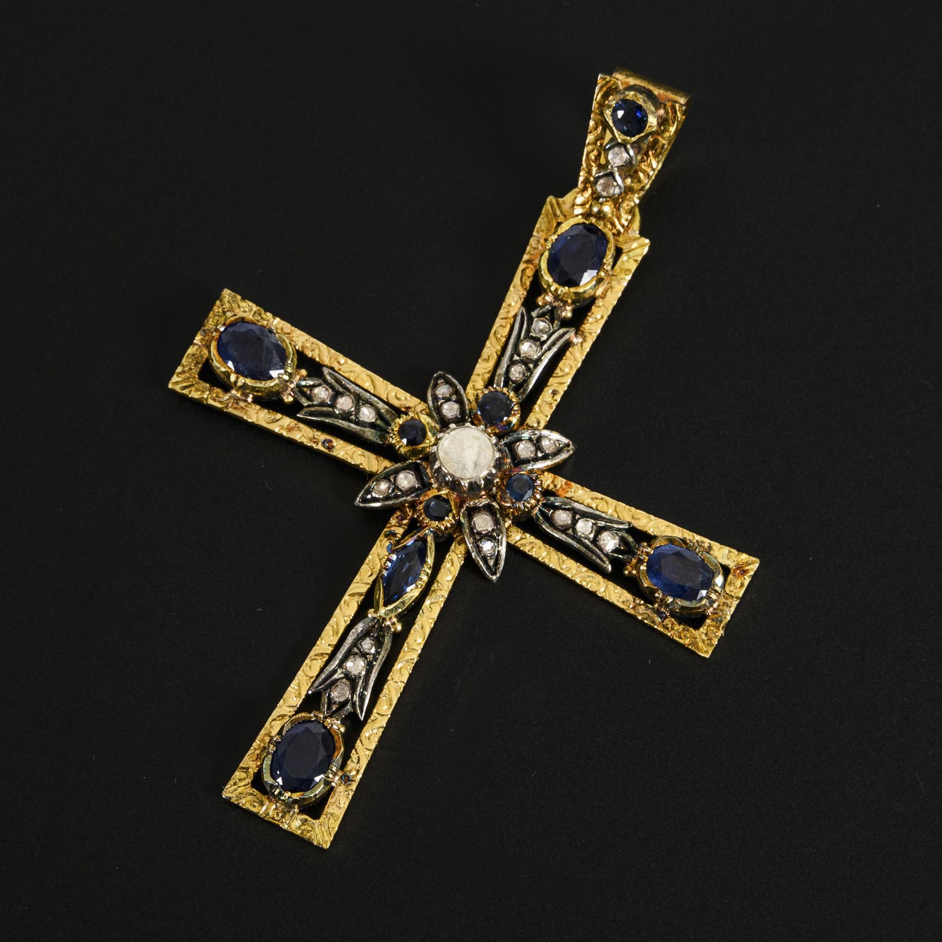 Anhänger in Kreuzform mit Besatz aus 10 natürlichen Saphiren und 21 Diamanten im Rosenschliff.