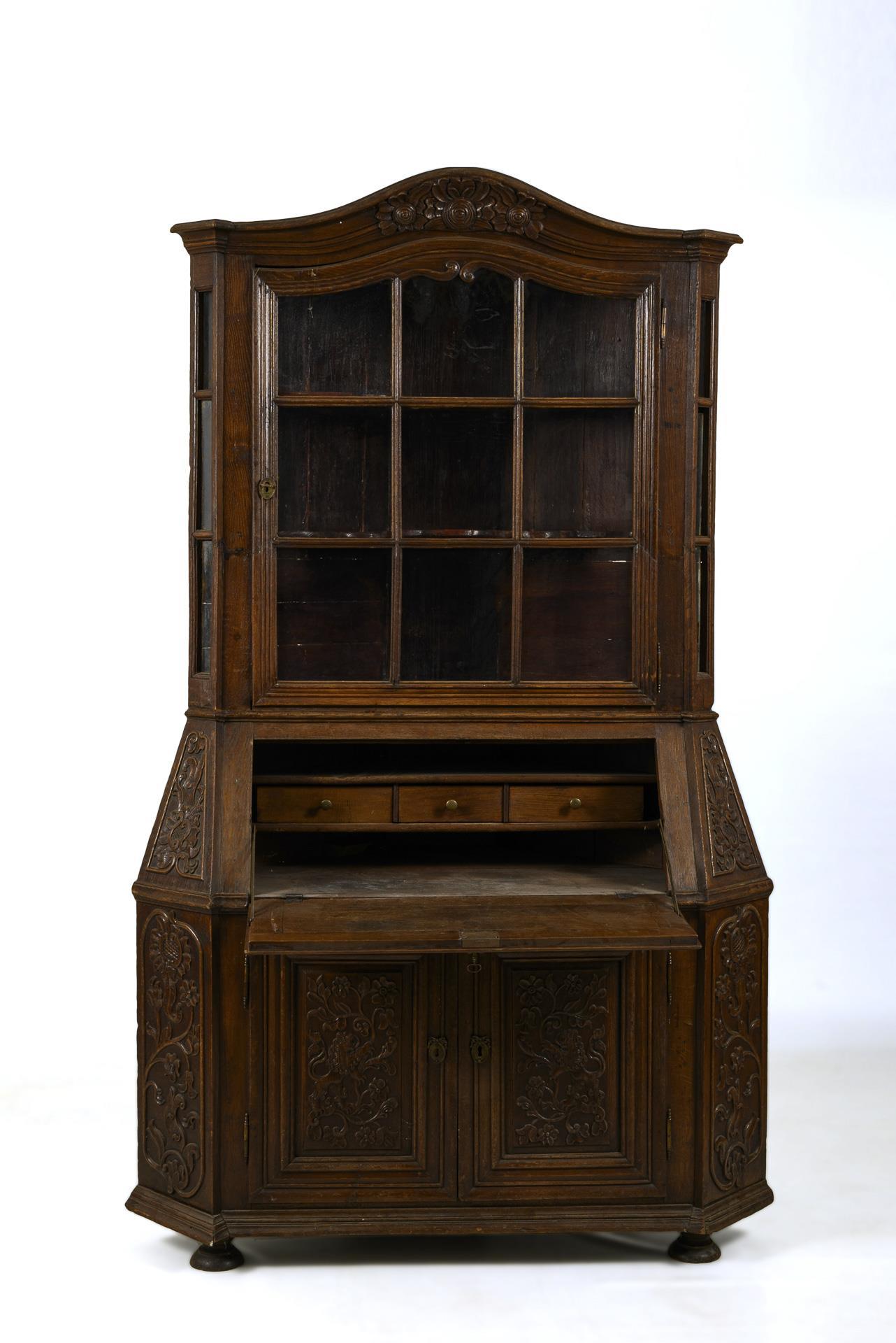 2-teiliger Eckkorpus mit geschrägten Frontkanten. 1-türiger Vitrinenaufsatz mit geschweiftem und floral beschnitztem Giebel, verzierende Kehlungen und gesprosste Verglasungen. 2-türiger Unterschrank mit Schrägpult und klappbarer Schreibplatte, kassettierte und kunstvoll beschnitzte Fronten mit floralem Rankwerk, Löwen und einem Reiter mit Pferden, monogrammiert und datiert "T St M C H 1787". Vitrine innen mit 2 geschweift geschnittenen Ablageböden, Schreibpult innen mit 2 offenen Ablagefächern und 3 jeweils innen unterteilten Schüben mit Messingknäufen, Unterschrank ohne Schlüssel und nicht zu öffnen. Ovale Schlüssellochbeschläge, teils mit Schleifenbekrönung, aus Messing, Schlösser aus Eisen. Alters- und Gebrauchsspuren, partiell leichte Defekte.