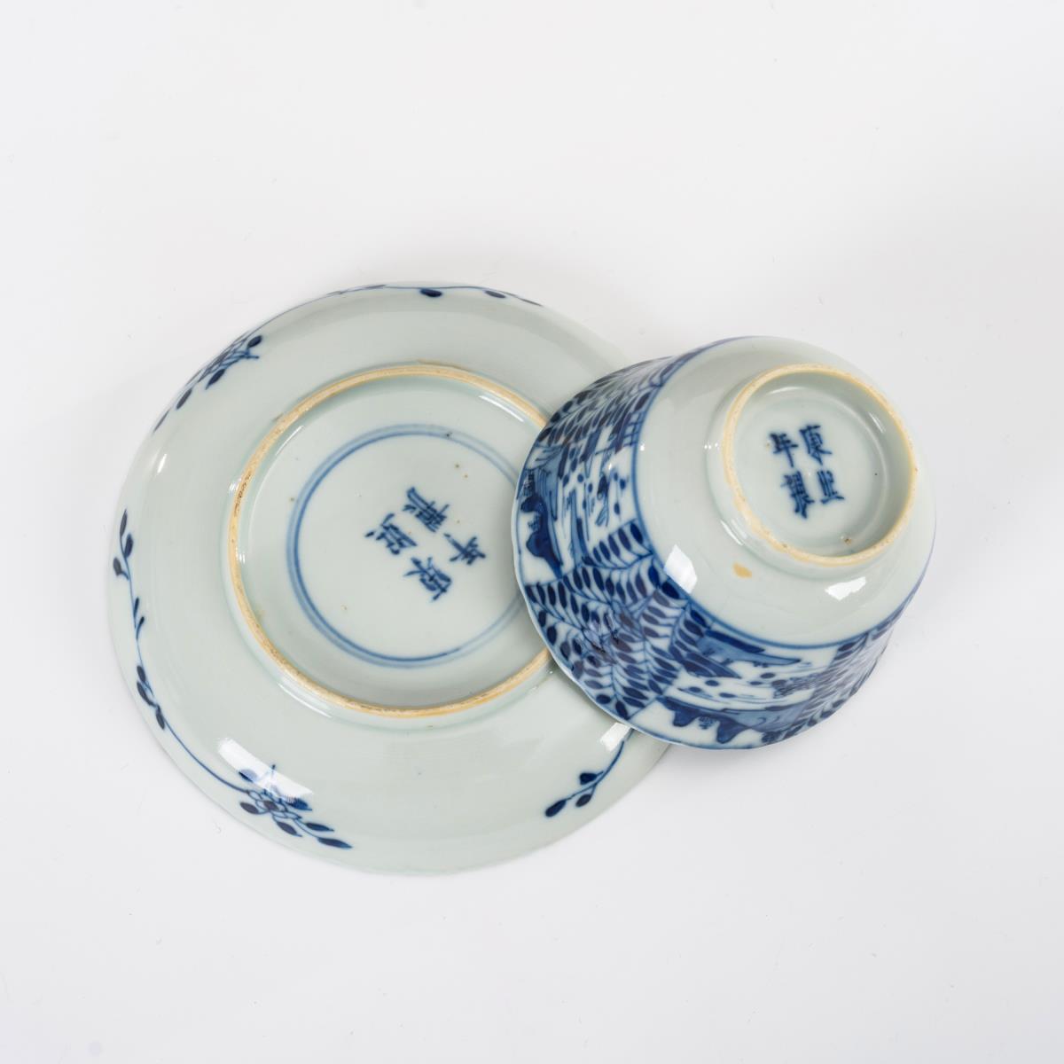 Porzellan mit unterglasurblauer Malerei. Teller Ø 13 cm, Koppchen H 6 cm.