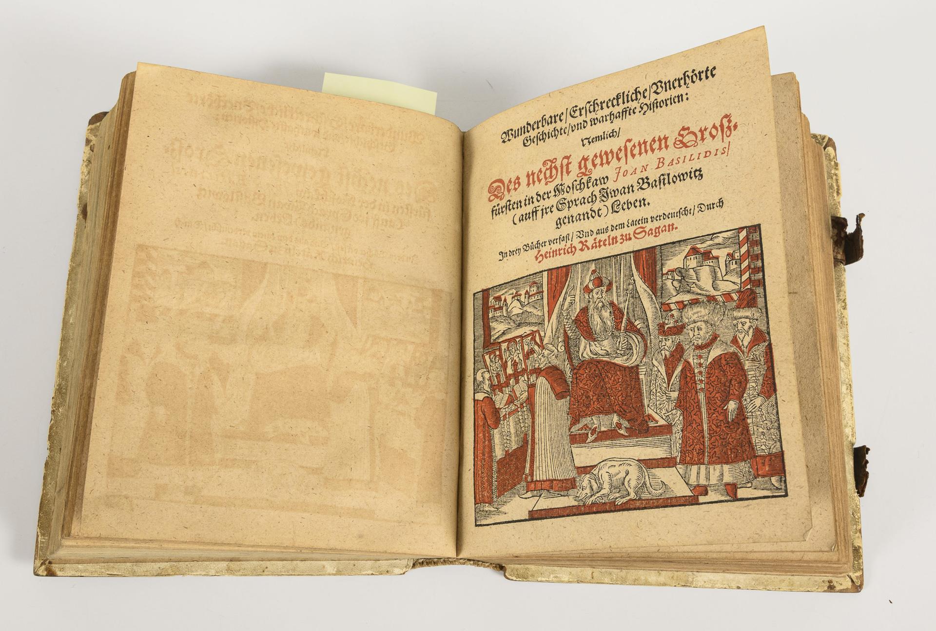 Kellner, Johann: "Ein Neuwe, Kurtze, doch warhafftige Beschreibung deß gar Großmaechtigen weitbegriffenen, bißhero vnbekandten Koenigreichs China ... in ... in Hoch-Teutsch gebracht", Gedruckt zu Franckfurt am Mayn, in Verlegung Sigmundt Feyerabends, 1589. Ursprünglicher Verfasser: González de Mendoza, Juan (1545-1618). Siehe auch: VD16 G 2654. Titel, (15), 181, (1) Seiten, unterteilt in drei Bücher. / Johann Vogel von Dreßden: "Bericht Von den alten Riesen und Hewnen, Auch was man noch heutiges Tages etwan ubriges von jnen finde ...", ursprünglicher Verfasser Jean Chassanion und Iohan.Cassione von Monstrohl. Gedruckt zu Görlitz durch Ambrosium Fritsch, 1588. Titel, (76) unnummerierte Seiten. Vergleiche auch VD16 C 2072. / Räteln zu Sagan, Heinrich: "Wunderbare, Erschreckliche, Vnerhoerte Geschichte, vnd warhaffte Historien: Nemlich, Des nechst gewesenen Großfürsten in der Moschkaw Joan Basilidis, (auff ire Sprach Iwan Basilowitz genandt) Leben". Gedruckt zu Görlitz, bey Ambrosio Fritsch, 1588. Titel, (232) unnummerierte Seiten. Diese frühe Ausgabe von 1588 ist nicht im VD16 verzeichnet. Nur VD16 O 262 und VD16 ZV 27295 jeweils von 1596 und anderer Drucker. Alles im geprägten, weißen Ledereinband mit defekten Schließen.