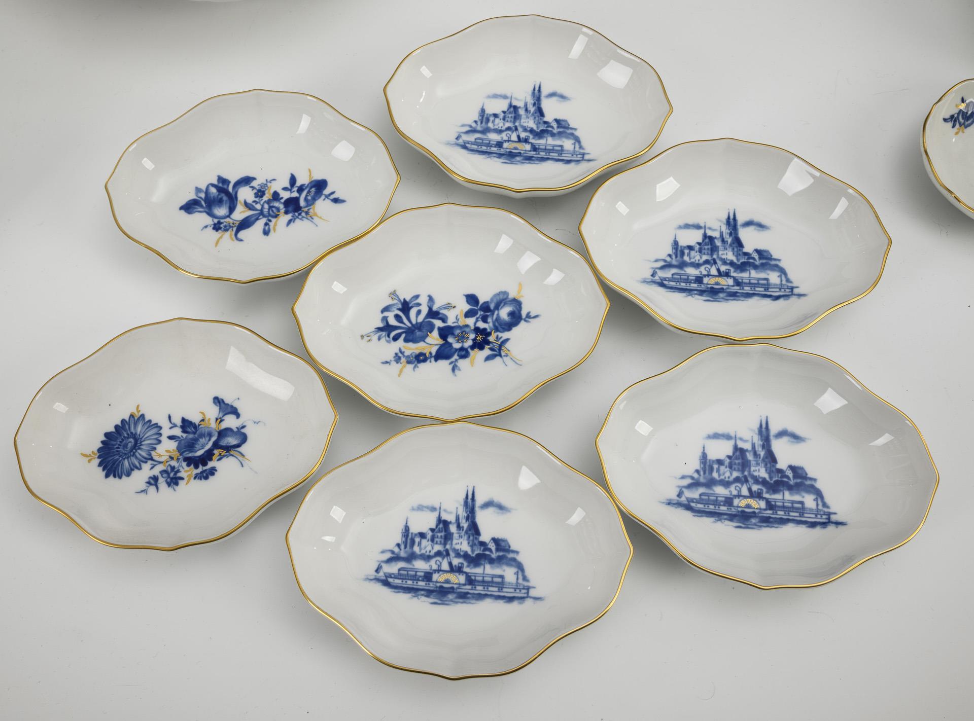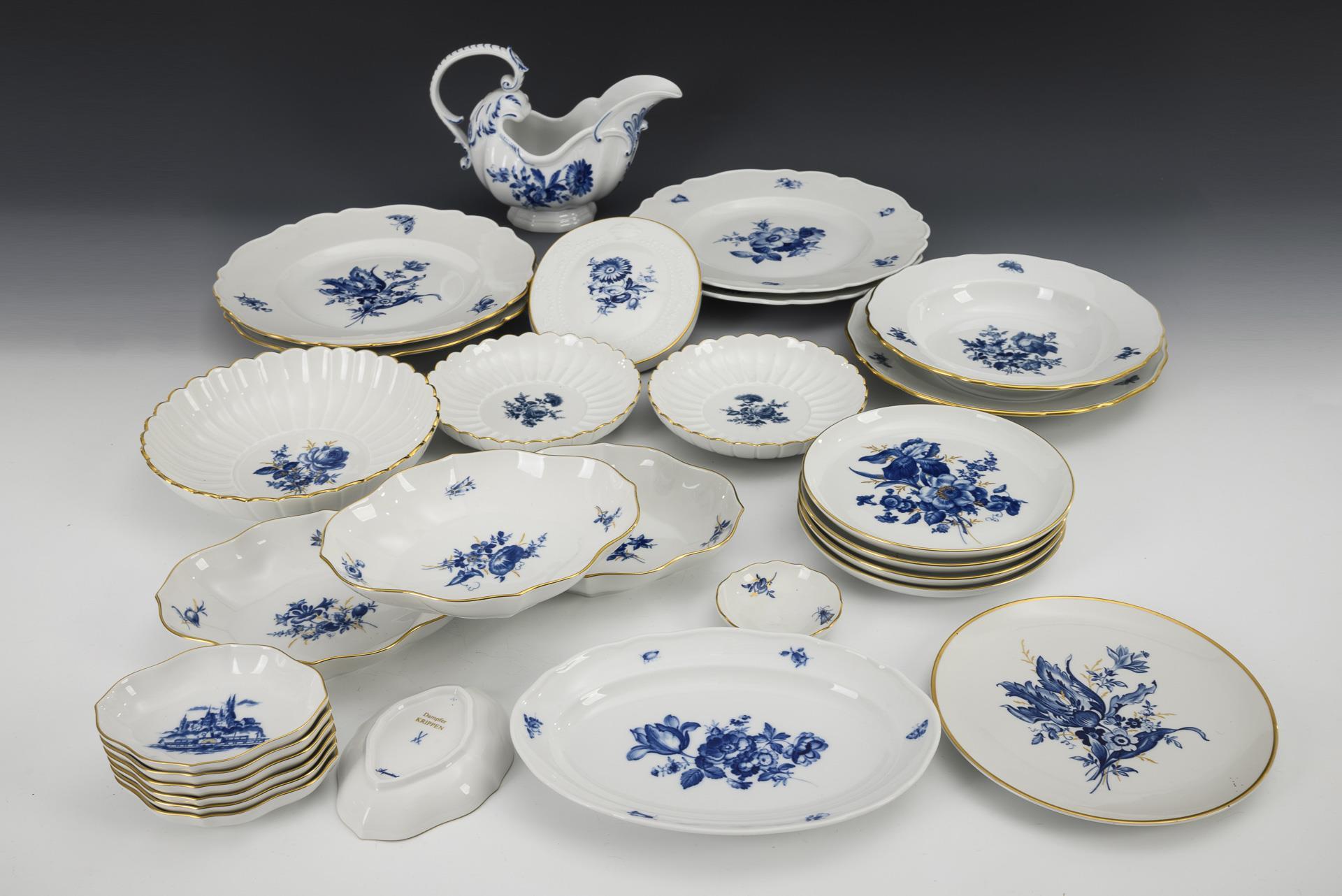 Form "Neuer Ausschnitt" mit Blumendekor, 4x mit Ansichtendekor "Dampfer Krippin". 4 Platzteller (Ø 27,5 cm), 1 Speiseteller, 1 Suppenteller, 1 Ovalplatte (L 23,5 cm), 3 + 7 Vierpassschalen (L 3x 19,5 cm und 7x 12 cm), 2 Fächerteller (Ø 16,5 cm), 1 Fächerschale (Ø 20,5 cm), 1 Nussschälchen (Ø 8 cm), 1 Sauciere (L 23,5 cm), 1 + 4 Wandteller (Ø 1x 19 cm und 4x 18 cm) und 1 Ovalplakette (L 16,5 cm).