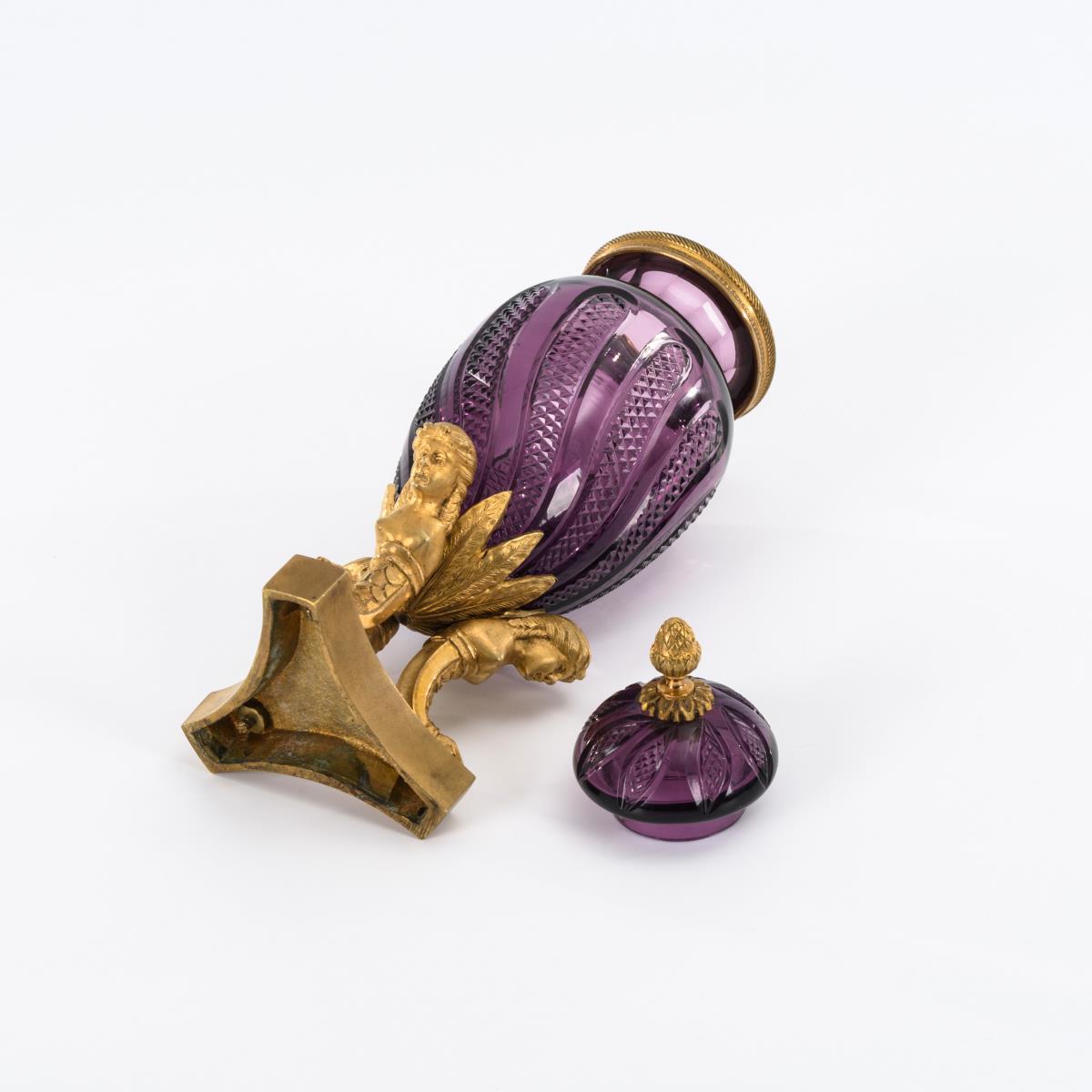 Ovoide Vase mit facettiertem Hals und geschweiften Steinelschliffstreifen auf der Wandung, Knaufdeckel. Mit bronzemontiertem Rand und Deckel, auf Bronzefuß mit drei Karyatiden. Minimale Bestoßung am Deckelrand.
