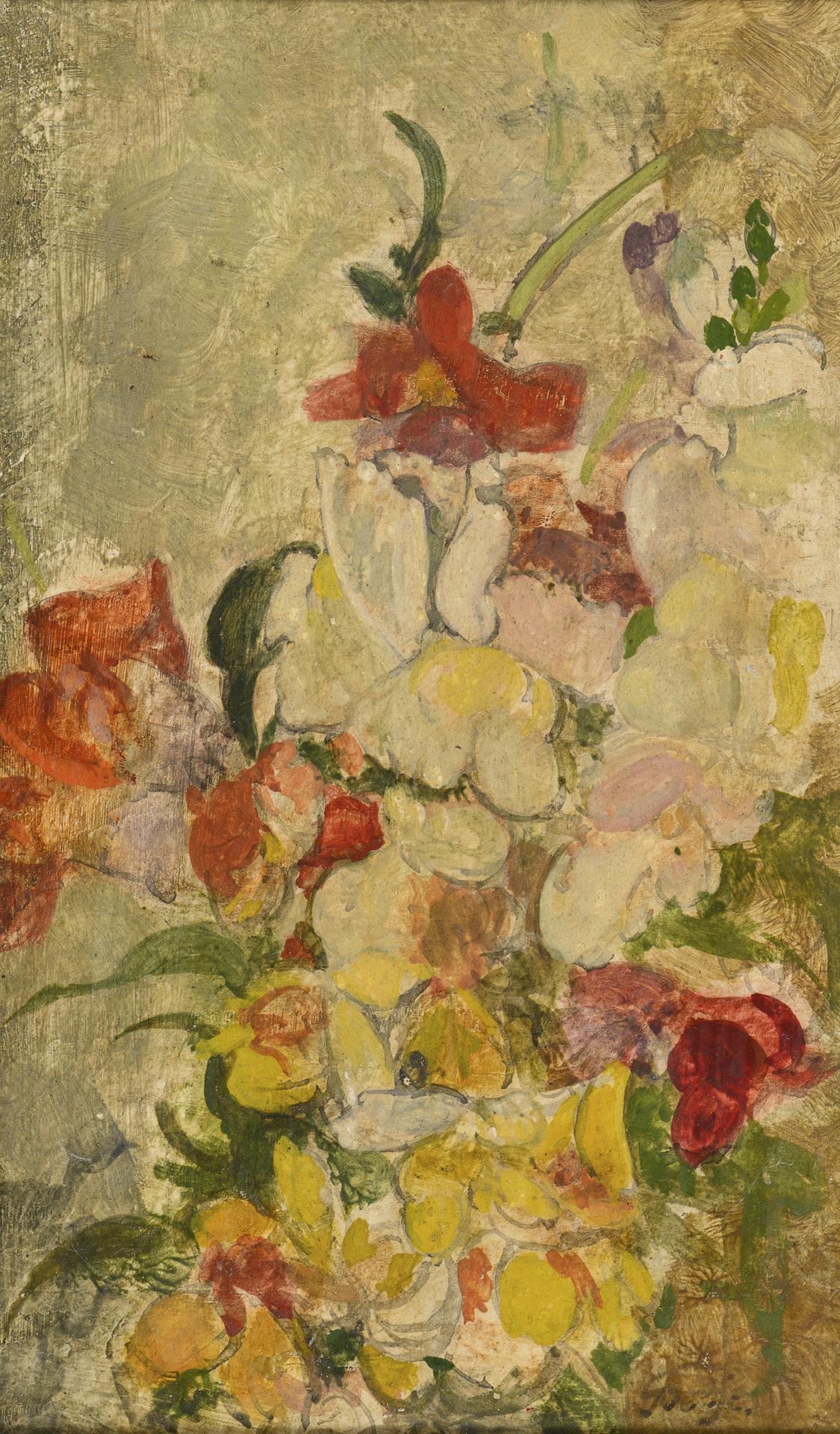 Rote, gelbe und weiße Blüten vor hellem Hintergrund.