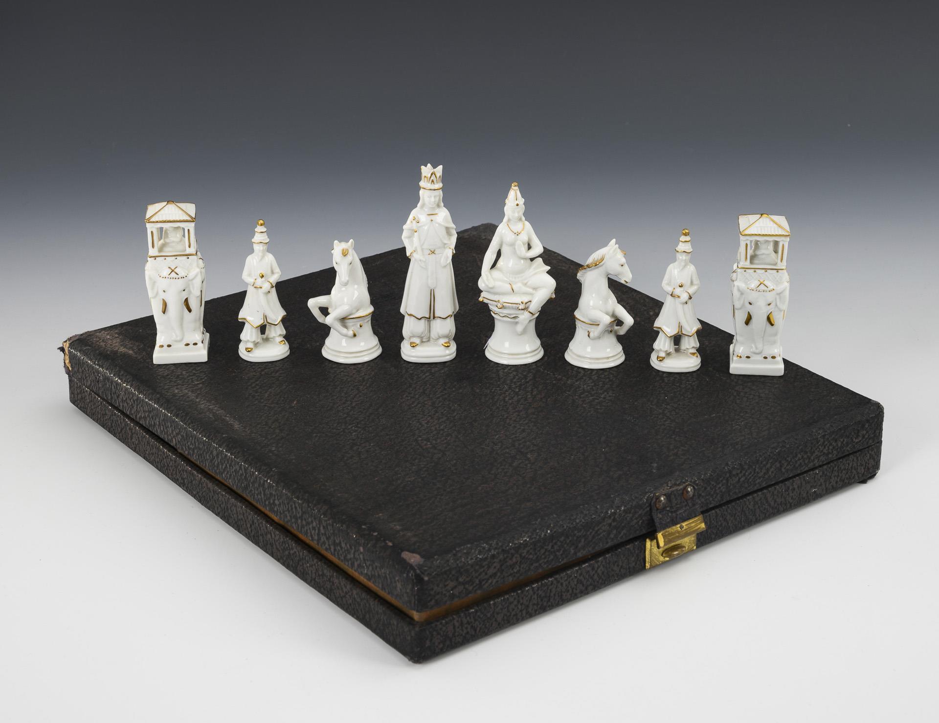 Im asiatischen Stil gearbeitetes Schachspiel mit 16 weißen und 16 korallenroten Schachfiguren, darunter asiatische Bauern, 4 Elefanten als Turm und 2 Göttinnen als Dame. Im Originaletui. Unterseitiger Chip am Sockel der weißen Göttin (Ø ca. 3 mm), kleiner Chip (Ø 2 mm) am Stand der roten Dame, minimaler Chip am Stand von 2 roten Bauern und 1 rotem Läufer (Ø 1-2 mm), 1 weißer Bauer mit Bestoßung am Hut und Sockel (Ø 3 und 4 mm), minimale Bestoßung am Ohr eines roten Pferdes.